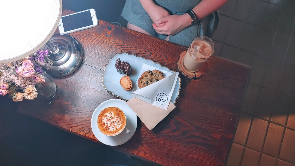 카페에는 당시 앙 버터가 유행하고 있던 터라, 앙 버터를 샌드 한 쿠키와 몇 가지의 스콘. 마들렌과 휘낭시에, 일반적인 수제 쿠키 그리고 까눌레가 있었다. 카푸 치노를 좋아하는 나는 카푸 치노를, 평소 좋아하는 밀크 티를 좋아하는 망구는 아이스 밀크 티를 선택했다. 밥을 먹고 와서 배가 부르니까. 요고만 먹자 하고 시킨 몇 가지 디저트.