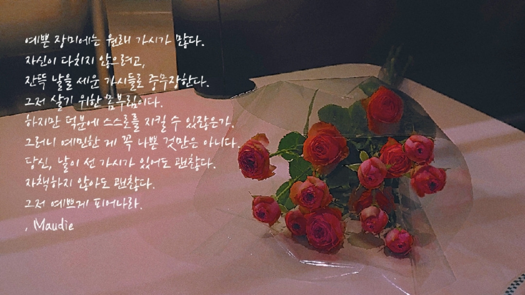 예쁜 장미에는 원래 가시가 많다. 자신이 다치지 않으려고, 잔뜩 날을 세운 가시들로 중무장한다. 그저 살기 위한 몸부림이다. 하지만 덕분에 스스로를 지킬 수 있잖은가. 그러니 예민한 게 꼭 나쁜 것만은 아니다. 당신, 날이 선 가시가 있어도 괜찮다. 자책하지 않아도 괜찮다. 그저 예쁘게 피어나라.
