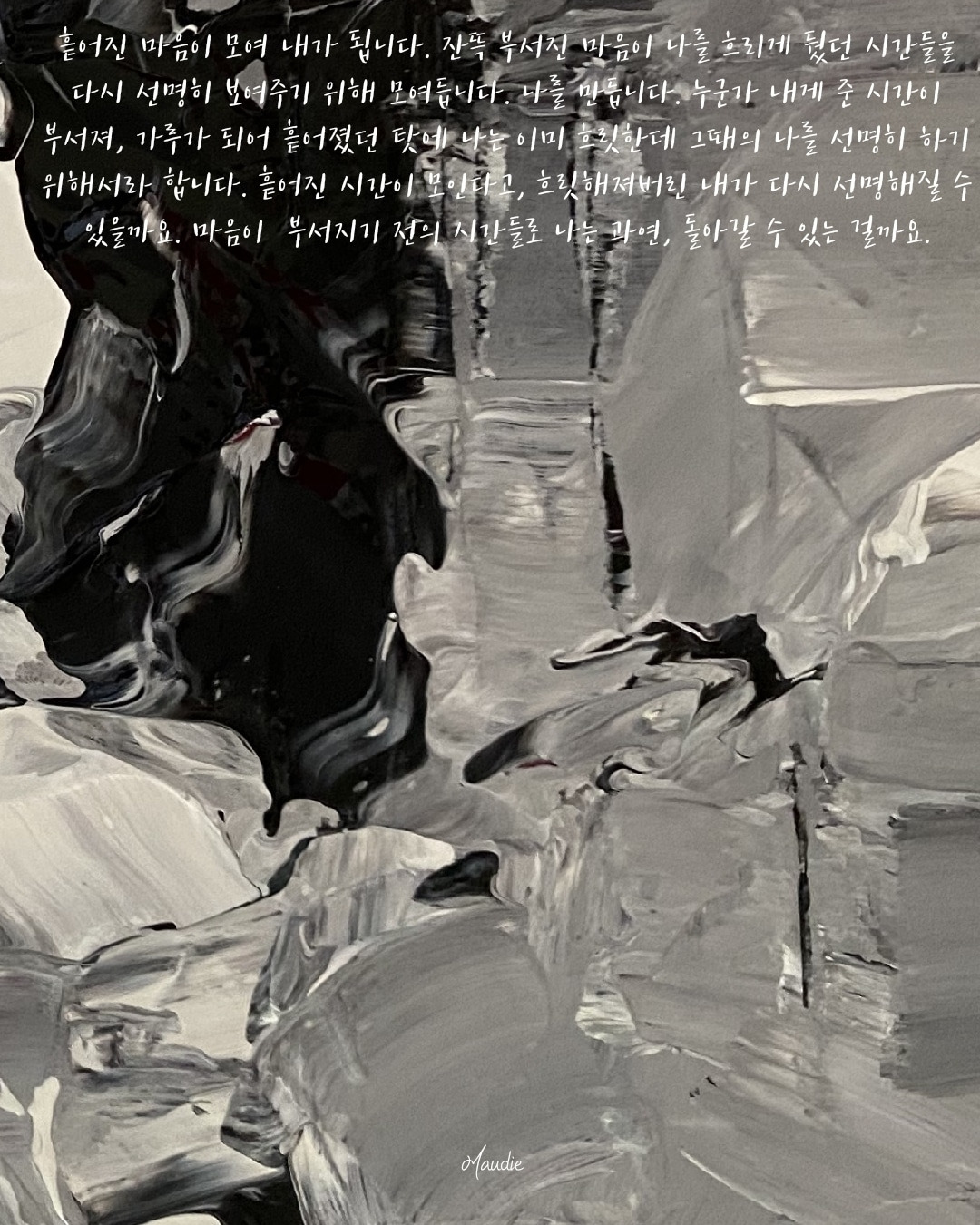 흩어진 마음이 모여 내가 됩니다. 잔뜩 부서진 마음이 나를 흐리게 뒀던 시간들을 다시 선명히 보여주기 위해 모여듭니다. 나를 만듭니다. 누군가 내게 준 시간이 부서져, 가루가 되어 흩어졌던 탓에 나는 이미 흐릿한데 그때의 나를 선명히 하기 위해서라 합니다. 흩어진 시간이 모인다고, 흐릿해져버린 내가 다시 선명해질 수 있을까요. 마음이 부서지기 전의 시간들로 나는 과연, 돌아갈 수 있는 걸까요.