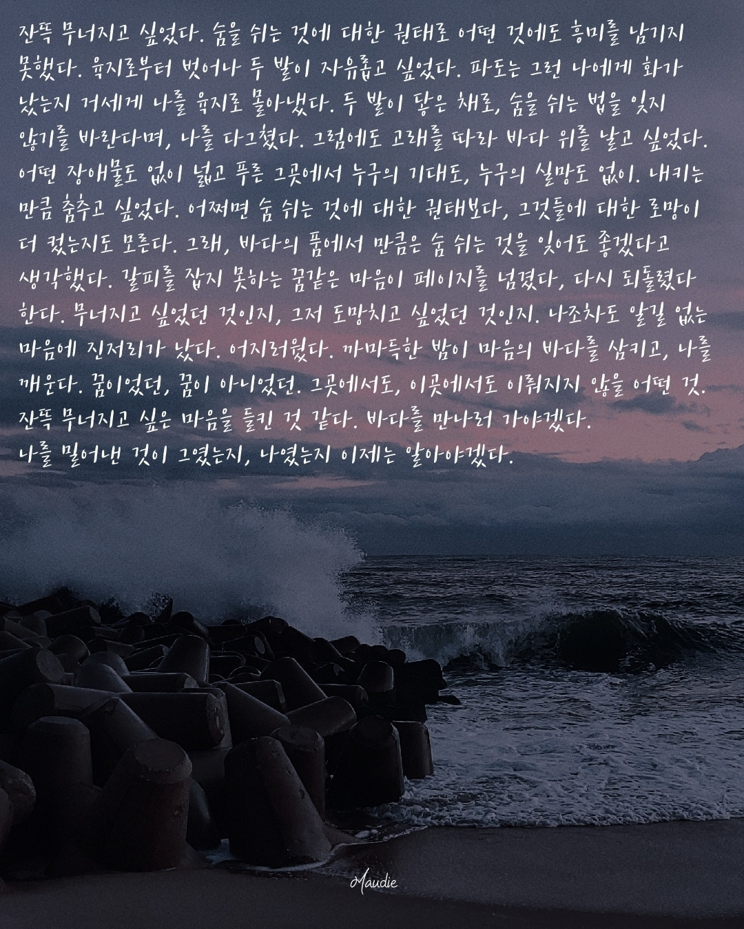 잔뜩 무너지고 싶었다. 숨을 쉬는 것에 대한 권태로 어떤 것에도 흥미를 남기지 못했다. 육지로부터 벗어나 두 발이 자유롭고 싶었다. 파도는 그런 나에게 화가 났는지 거세게 나를 육지로 몰아냈다. 두 발이 닿은 채로, 숨을 쉬는 법을 잊지 않기를 바란다며, 나를 다그쳤다. 분명 파도가, 바다가 그랬다. 고래를 따라 바다 위를 날고 싶었다. 어떤 장애물도 없이 넓고 푸른 그곳에서 누구의 기대도, 누구의 실망도 없이. 내키는 만큼 춤추고 싶었다. 어쩌면 숨 쉬는 것에 대한 권태보다, 그것들에 대한 로망이 더 컸는지도 모른다. 그래, 사실은 모두 거짓말이다. 바다의 품에서 만큼은 숨 쉬는 것을 잊어도 좋겠다고 생각했다. 갈피를 잡지 못하는 꿈같은 마음이, 페이지를 넘겼다, 다시 되돌렸다 한다. 무너지고 싶었던 것인지, 그저 도망치고 싶었던 것인지. 나조차도 알길 없는 마음에 진저리가 났다. 어지러웠다. 나는 무엇을 하고 싶었던 것일까. 어떻게 하고 싶었던 것일까. 혹시 이런 고민을 하는 것 따위도 가치 없는 일은 아닐까. 혼란스러운 마음에 눈을 뜨면, 침대 위. 아침이다. 까마득한 밤이 마음의 바다를 삼키고, 나를 깨운다. 꿈이었던, 꿈이 아니었던. 그곳에서도, 이곳에서도 이뤄지지 않을 어떤 것. 잔뜩 무너지고 싶은 마음을 들킨 것 같다. 바다를 만나러 가야겠다. 나를 밀어낸 것이 그였는지, 나였는지 이제는 알아야겠다.