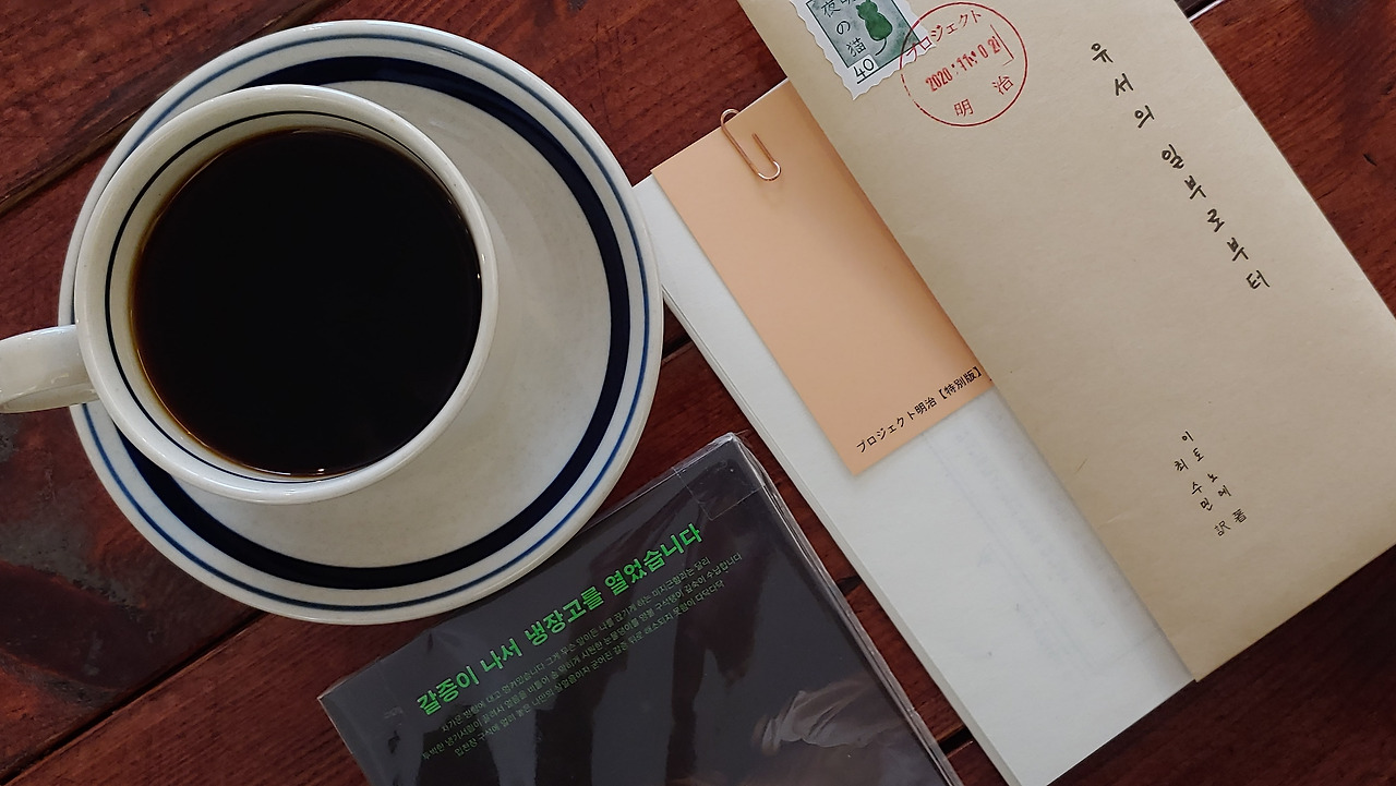 오평이라는 서점에서 발견한 궁금하지만 쉽게 읽어 볼 생각을 하지 못했던 '유서의 일부로부터'. 다른 사람의 선택을 받아 서점을 떠나는 것을 보고 용기를 내어 데려오게 된 이것. 제목만으로도 충분히 쏟아지는 눈물을 닦아내기 바쁠 것 같은 느낌이 들어 데려오고도 한참을 열어보지 못했다. 그러다 아껴뒀던 책 ' 갈증이 나서 냉장고를 열었습니다'와 함께 드디어 열어보기 위해 동네 조용한 카페로 가지고 나왔다. 명절 연휴의 마지막 날이라 그런지 예상과는 달리 소란스러운 카페 안이라 집중을 할 수 있을까란 의문을 가지고 두 이야기를 감싼 비닐을 뜯었다. 그리고 짧은 이야기가 들었을 '유서의 일부로부터'를 먼저 꺼내 읽었다.