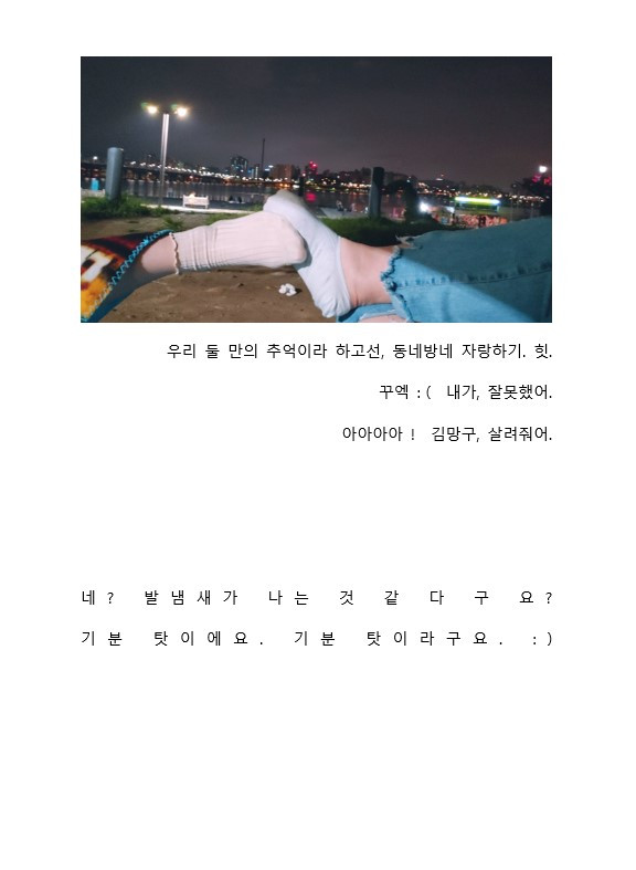 시간이 지나니까 엉덩이가 아파가지고, 누우려고 하니 잔디밭에 돌이 있었어. ‘아야! 아야!.’ 하면서도 굳이 드러누워서 하늘 구경도 하고. 발 맞대고 사진도 찍었는데. (차마 그 사진은 공개를 못하겠다. 우리 둘만의 추억인 걸로.) 우리 그날 진짜 고등학생이 된 것처럼 깔깔 웃었어. 밤새. 그렇게 신나게 웃고 떠들다가 갑자기 나타난 아저씨가 있었어. 한강이 보이는 계단 앞에 혼자 앉아있는 아저씨를 보고 누워있던 몸을 일으켜 다시 원래의 자리로 돌아와 바로 앉았어. 생판 모르는 아저씨 등짝이 너무 슬퍼 보인다고 두 시간을 내내 얼마나 걱정했는지. 아무 일도 일어나지 않아서 참 다행이었지.