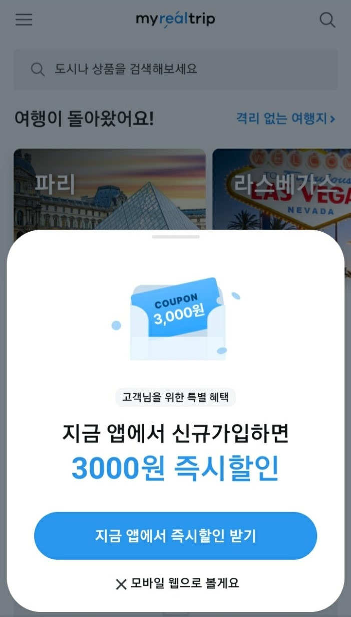 ▲ 브랜드마다 혜택을 강조한 문구들을 선택했다. 수치화된 할인율과 사회적 증거(2,000만명의 선택)를 함께 제시하면서. [앱으로 보기], [앱 이용하기] 등 또다른 버튼문구 등장. 눈에 띄는 버튼 컬러로 시선 유도. 그 외 버튼은 아웃라인도 없이 하단에 연한 컬러로 배치하거나 아예 없이 X 표시만 해두었다.(여기어때)