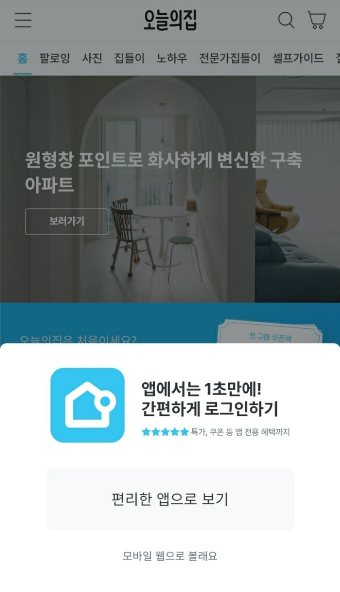 ▼ 중고나라와 오늘의 집은 '편리성'을 강조했다. 특히 오늘의집 버튼문구는 [ 편리한 앱으로 보기 ]