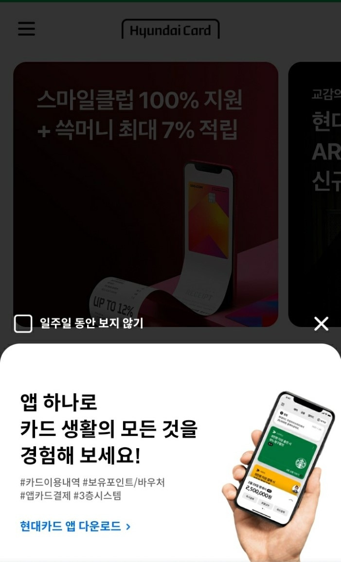 - 현대카드는 [일주일 동안 보지 않기]로 파격 혜택(?) 문구를 선택했다. (다른 곳엔 '7일간 보지 않기'도 있다.) 아무튼, 오늘 vs. 일주일... 당신의 선택은?