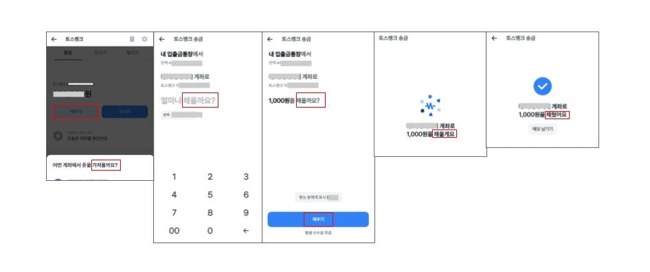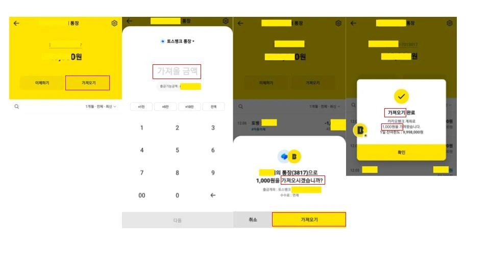 카카오뱅크는 [가져오기]로 쓴다. 간단명료하다. 토스뱅크의 [채우기] 기능이 어려운 건 아니지만, 모든 단계(가져오기 > 가져올 금액 > 가져오시겠습니까? > 가져왔습니다 > 가져오기 완료)에 걸쳐 가져오다 동사를 일관되게 사용하므로 한결 정돈된 느낌을 받는다. 본디부터 ‘가져오기’란 말이 더 익숙해서 편안함을 느끼는지도 모르지만.