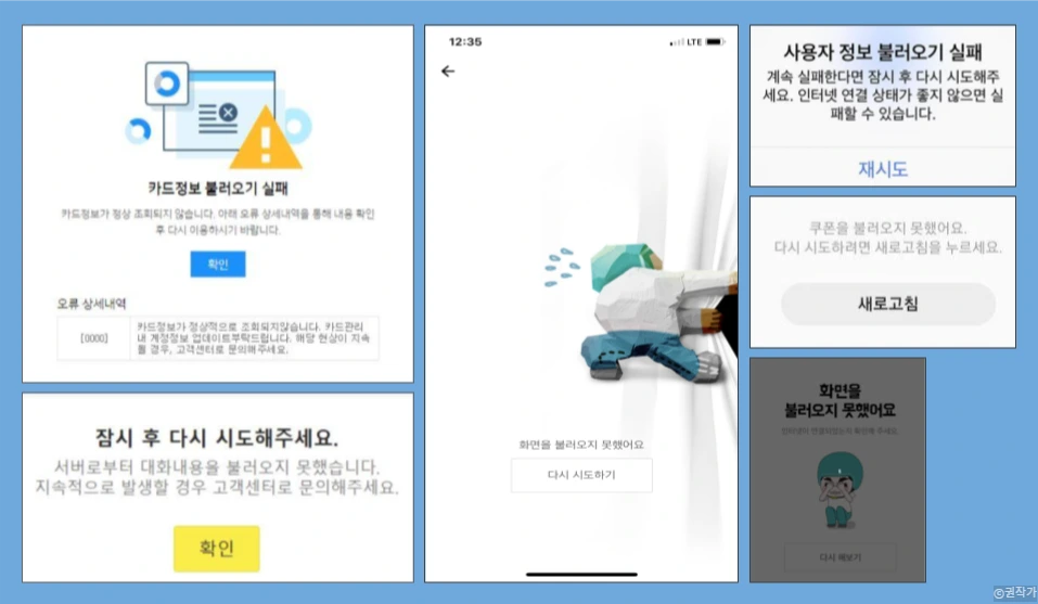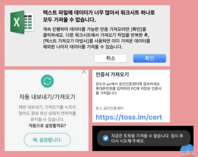 그렇다면, 다시 원점으로 돌아가서 우리 회사의 보스는 왜 ‘불러오기’가 더 많이 쓰이고 있다고 봤을까? 나는 [가져오기 / 불러오기]가 쓰인 거의 대부분의 상황을 스크래핑 했다. 생각보다 쓰이는 상황은 그리 다양하지 않았다. [화면을 불러오지 못했어요]의 경우 ‘가져오지 못했어요’보다 확실히 자연스럽다. 불러오기를 가져오기로 대체할 수 없는 유일한 예시였다. (페이지를 열 수 없다는 표현도 가능)