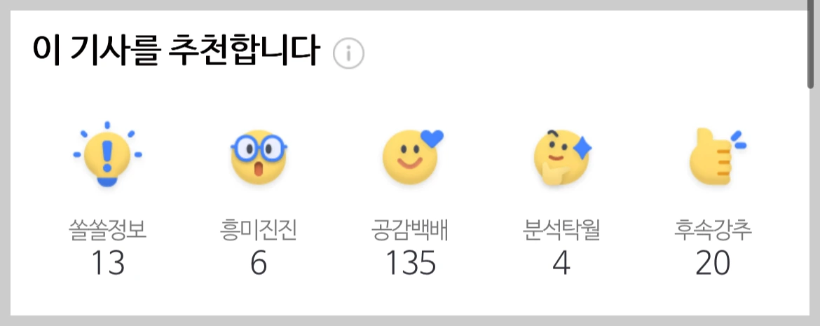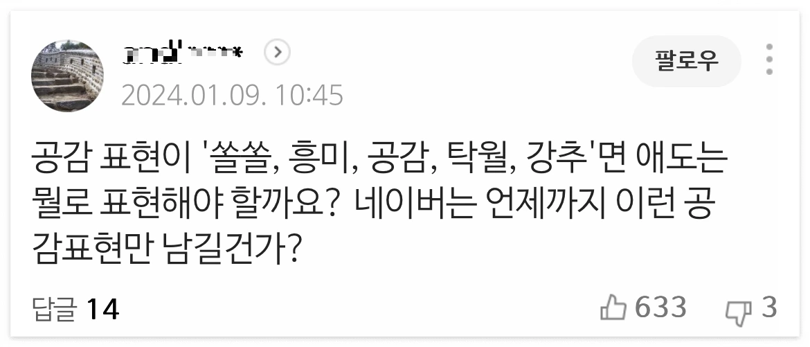 나는 F형 인간이라 본능적으로 감정을 표현하는 데 익숙하다. 킬링타임용으로 읽는 기사라도, 구내식당 급식을 먹더라도, 공항 내 화장실을 이용하더라도, 도서관 키오스크에서도, 롱블랙을 읽고 나서도, 유튜브를 보고서도 난 늘 감정(소감)을 표현한다. 그런 내게 네이버 공감 표현 방식은 뭐랄까, 내 감정이 통제되고 있다는 불쾌감을 주기에 충분했다.