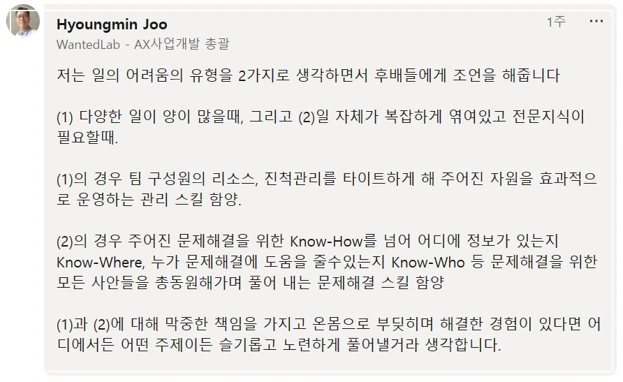 올해 들어 한 가지 머릿속에 늘 구상 모드로 On 해둔 게 있다. 바로 '일 잘하는 법'이다. 프로페셔널하게. 전생에 소가 아니었나 싶을 만큼 일복이 있는 편인데, 피할 수 없다면 즐기라고 이왕이면 잘하고 싶은 마음이 크다. 연차가 쌓이고 나이를 먹을수록 최소한의 자기 몫, 그러니까 1인분은 꼭 해야 한다고 생각한다. 그동안의 경험이 전혀 쓸모가 없는 게 아니라고 스스로 증명해 보이기라도 하려면 1인분은 감당해야 할 몫이 아닐까. 기독교에는 고난이 유익이라는 말이 있다. 사회생활도 마찬가지인가 보다. 링크드인에서 같은 맥락의 글을 발견하곤 단숨에 읽어 내려갔다.
