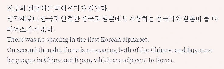 · 최초에 한글에는 띄어쓰기가 없었다고 한다. 만약 누군가 띄어쓰기를 시도하지 않았다면? '아버지가방에들어가신다'와 같은 숨 막히는 형태로 글을 읽어야만 했겠지.