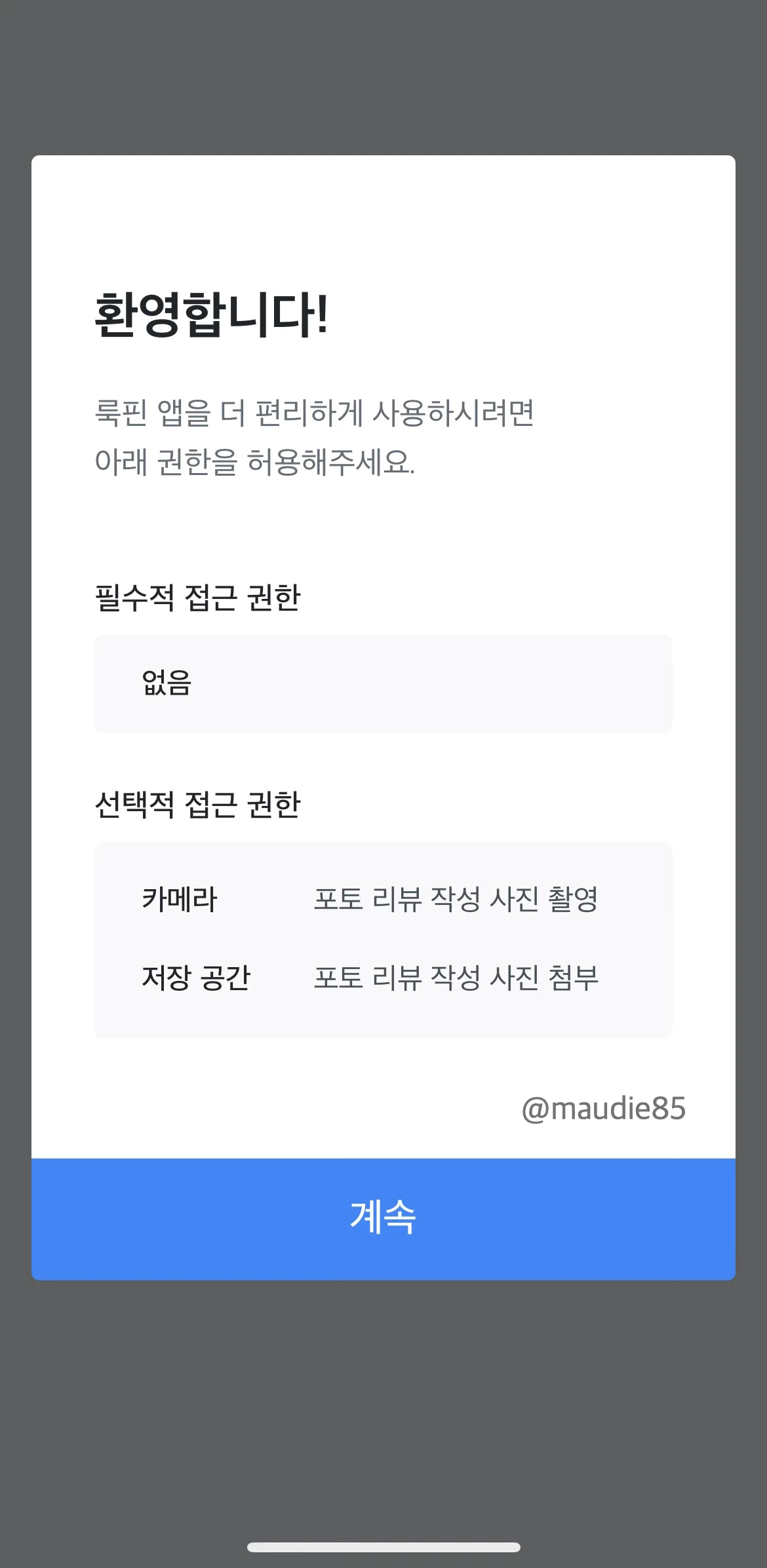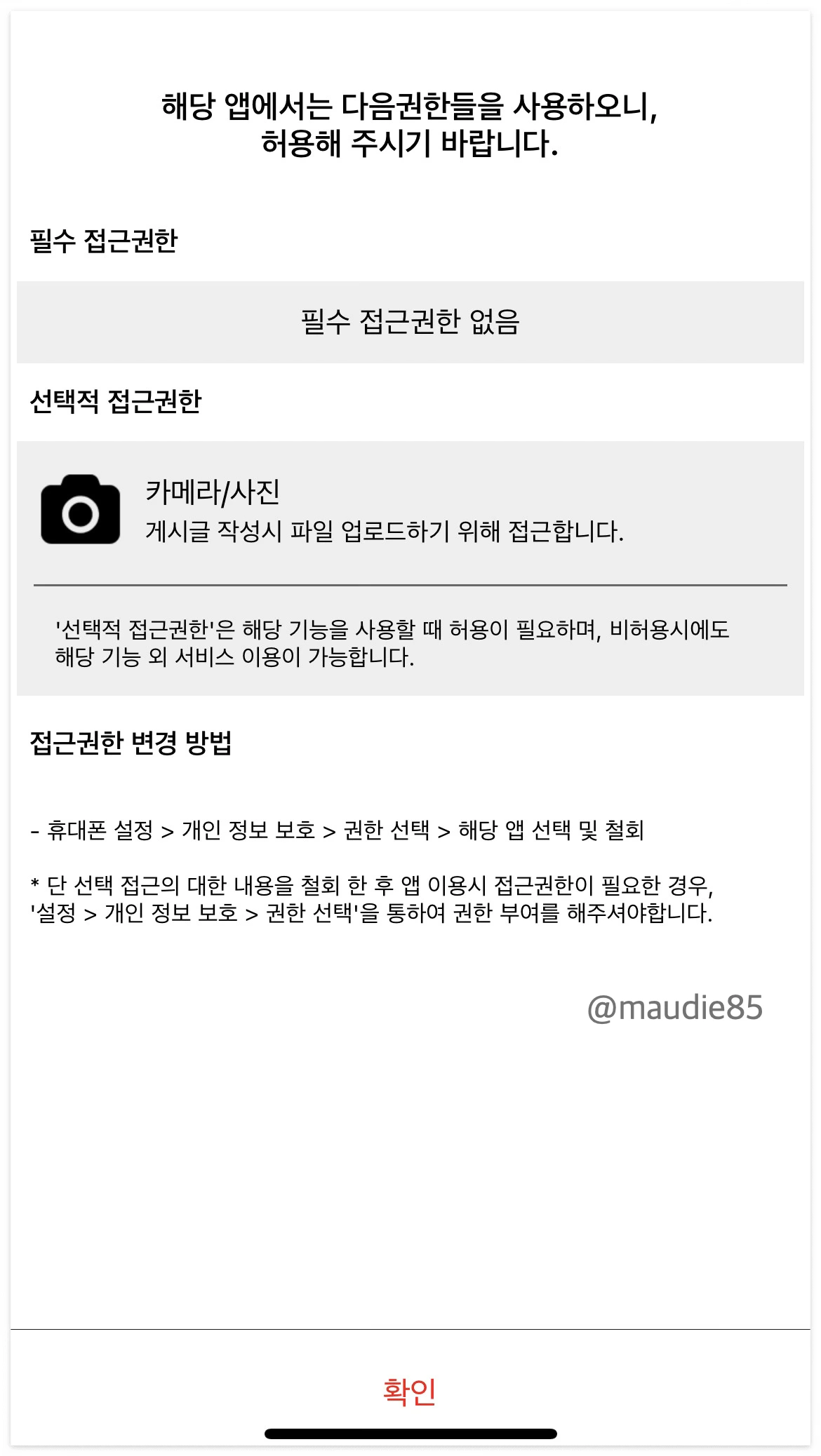 적용: 프로필 사진을 변경하려면 카메라 접근 권한이 필요합니다. [허용] 또는 [나중에]