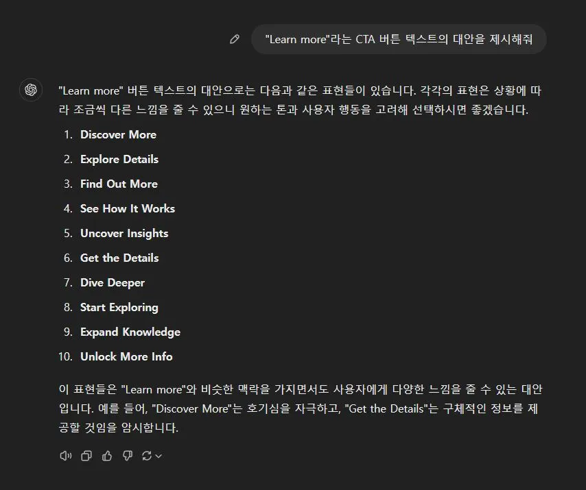 [프롬프트] "Learn more"라는 CTA 버튼 텍스트의 대안을 제시해 줘