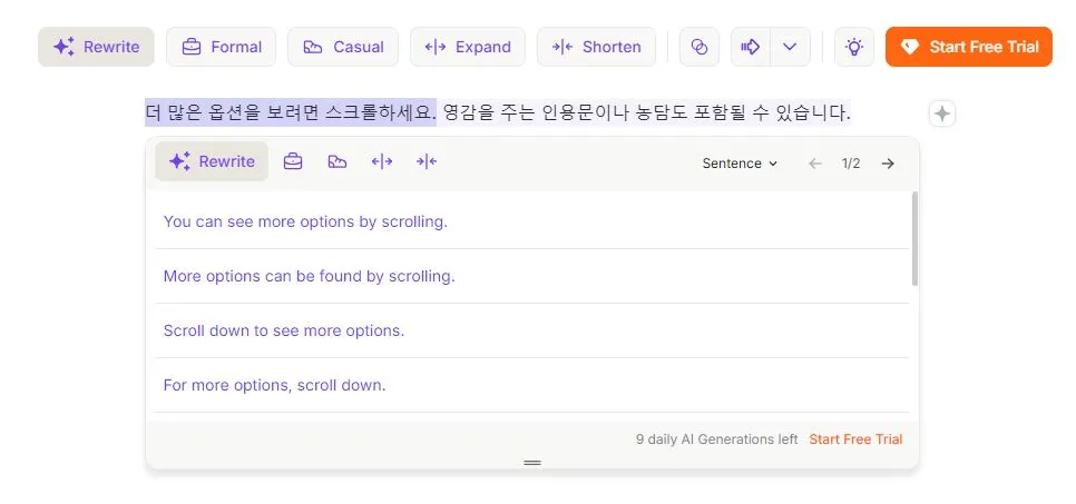 (무료 사용자는 하루에 10건 정도 체험 가능, 한국어 설정은 되지만 톤 적용은 안 됨)