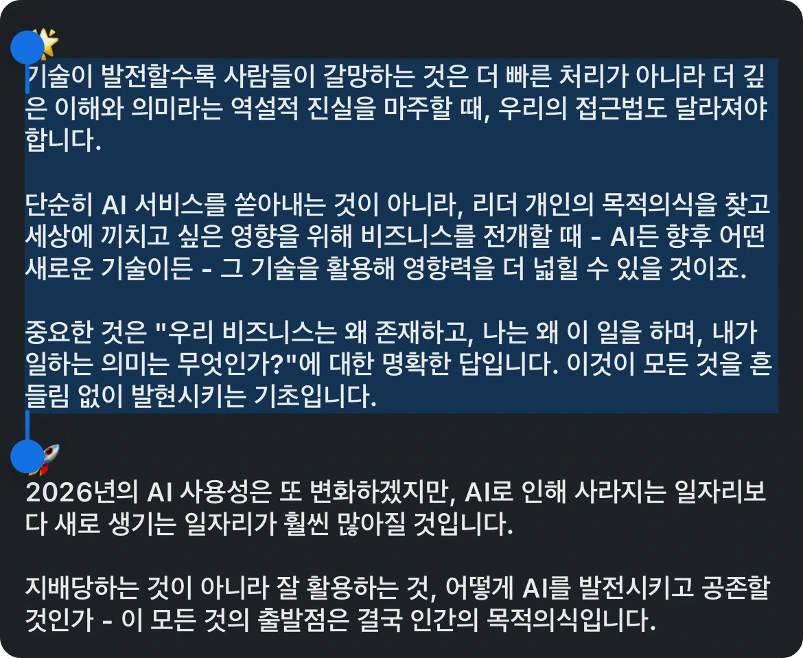 불과 1~2년 전만 해도 에이아이를 업무에 사용하는 것에 대한 불신의 티끌이 있었다. 하지만 이제는 비용을 지불하고 쓰는 하나의 '도구'가 되었다. 그 흐름에 맞춰 에이아이는 이렇게 써야 해, 저렇게 써야 해 하는 사용법 안내가 우후죽순 등장하기 시작했다. 나도 좀 더 편하게, 효율적으로 에이아이를 쓰기 위해 몇몇 글들을 찾아 읽기도 했다. 그런데 정작 에이아이를 잘못 쓰는(또는 생각하는) 누군가를 위한 '헬퍼텍스트'가 없다는 사실에 안타까움을 느꼈다.