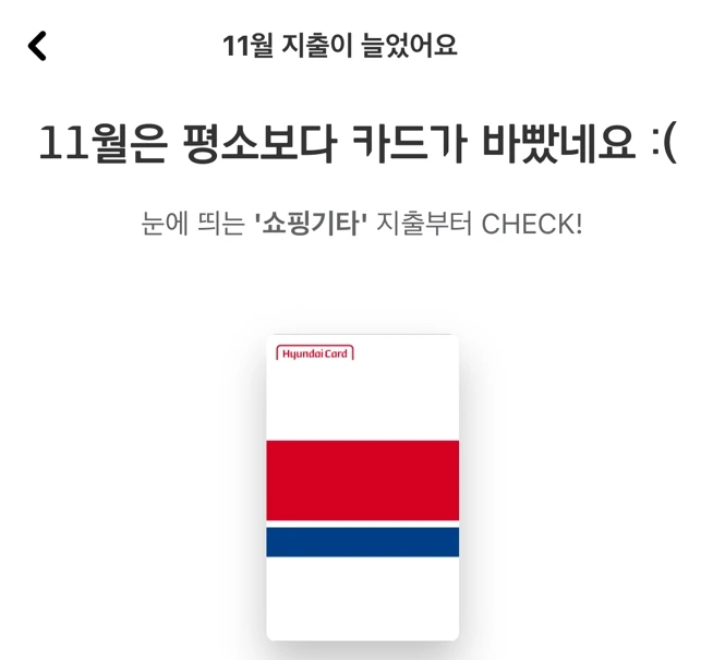 11월은 평소보다 카드 사용이 많았습니다, 지출이 늘었습니다 로만 끝나지 않아서 좋다. 특히 카드를 많이 쓴 상황이 좋을 리 없는데 기분 나쁘지 않게 긍정적으로 전달하는 메시지라고 생각한다.