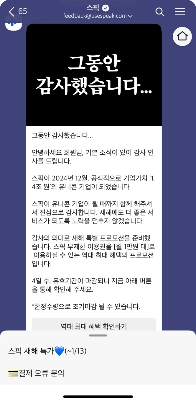 그러나 내용은 반전. 유니콘 기업이 되어 특별 프로모션을 준비했다는 마케팅 메시지였다. 사용자를 낚은 일에는 성공이었는지는 모르지만, 그동안 감사했습니다.. 라는 표현과 클리셰가 과연 적합한가에 대해서는 물음표다. 마치 양치기 소년을 만난 느낌이랄까.