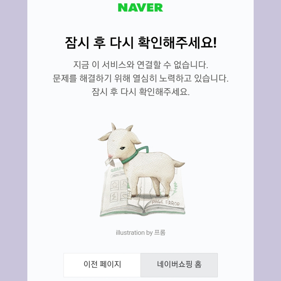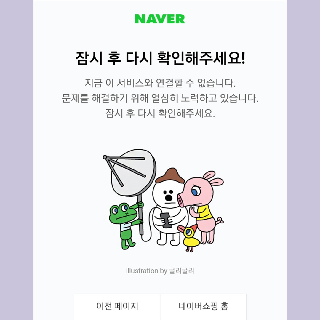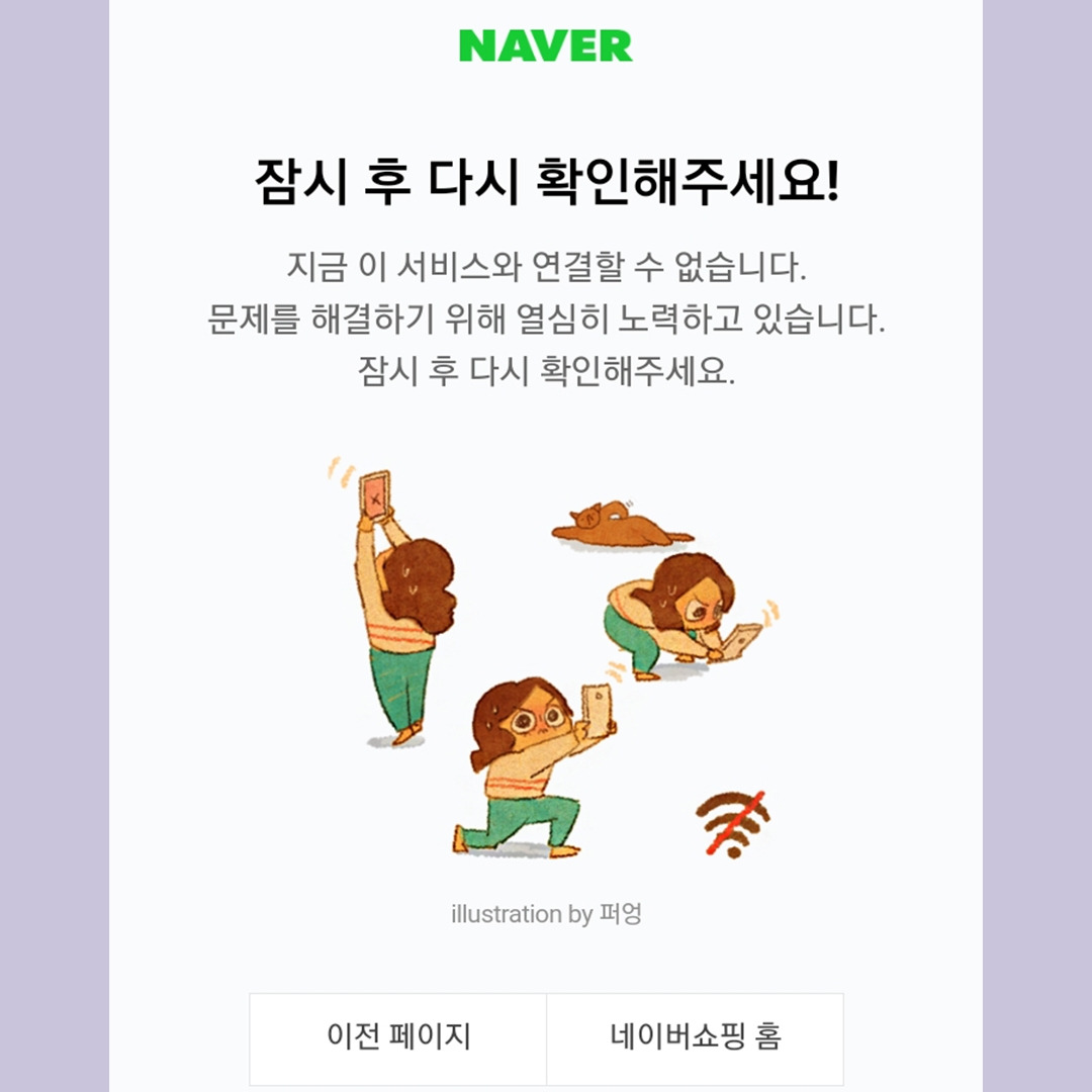 늦은 밤 휴대전화로 네이버 쇼핑을 하다가 예상하지 못한 화면 전환으로 살짝쿵 좌절을 경험했다. 더 이상 진도가 나가지 않아 화가 날 뻔했지만 귀여운 일러스트와 이 문제를 해결하기 위해 '노력하고 있다'는 메시지에 참을성을 되찾았다. 그라폴리오 작가들과 콜라보한 네이버의 오류 메시지는 보는 즐거움이 있었다. 다만, 네이버 오류 메시지 역시 아쉬운 점이 있었다.