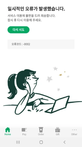 주말 오후, 스타벅스 앱으로 금액을 충전하려다가 데이터 먹통으로 오류 화면이 떴다.