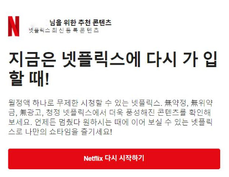 '더 이상 보고 싶은 콘텐츠'가 없어서 해지한 고객에게 보내는 메시지라는 명확한 목적이 있으니 이전에 유저가 넷플릭스에 오랫동안 체류하며 즐겼던 콘텐츠를 분석해서 유저의 취향을 두드리는 메시지를 보냈으면 더 좋지 않았을까? 다른 사람들은 어떤 내용의 이메일을 받아보는지 궁금하다. 넷플릭스도 여러 가지 시나리오를 갖고 있겠지. 아무튼 적어도 나 같은 사람에게 재가입을 독려할 땐, 탈퇴의 이유를 들여다보고 트리거가 될 만한 '감성'을 자극하는 게 필요하지 않을까?