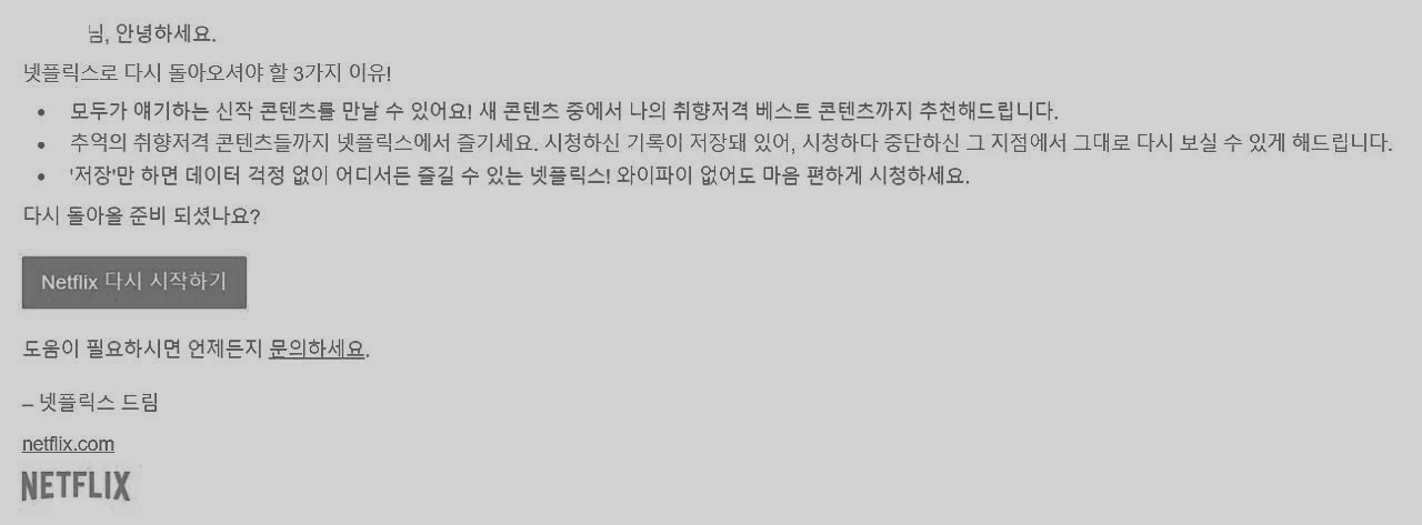 일 년에 세 번꼴로 넷플릭스 구독-해지-재구독 사이클을 밟는다. 끌리는 콘텐츠가 있으면 보고, 더 이상 매력적인 콘텐츠가 없으면 해지하기 때문이다. 넷플릭스에서는 구독하면 구독했다고, 해지하면 해지했다고 이래저래 메일로 알림을 보내오는데 UX Writer로 전향한 이상, 메일 글귀에 눈길이 가서 콘텐츠로 담아본다.