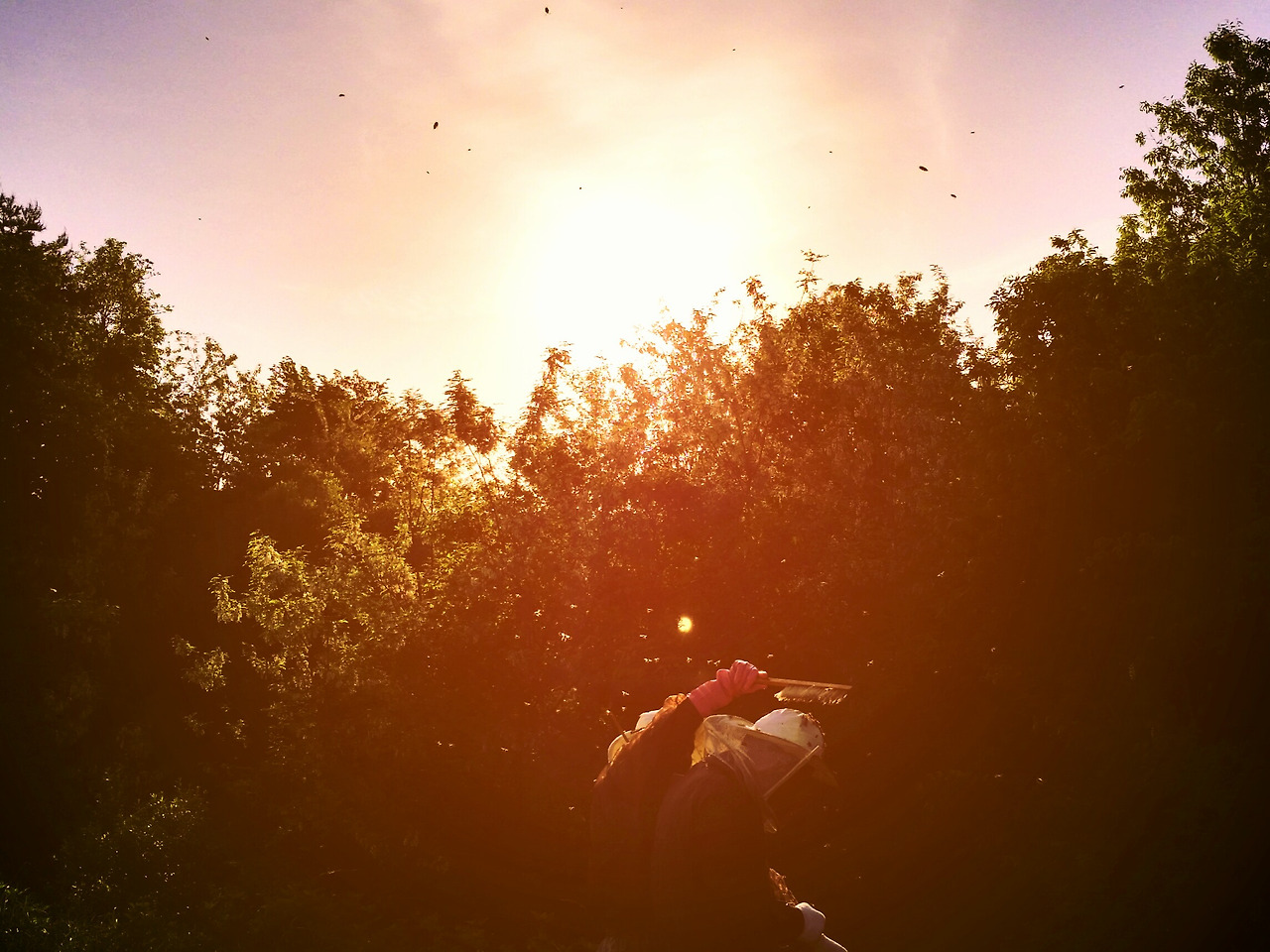 연기 분무기에 쑥을 넣어 불을 댕기고 채집통들을 늘어놓습니다.