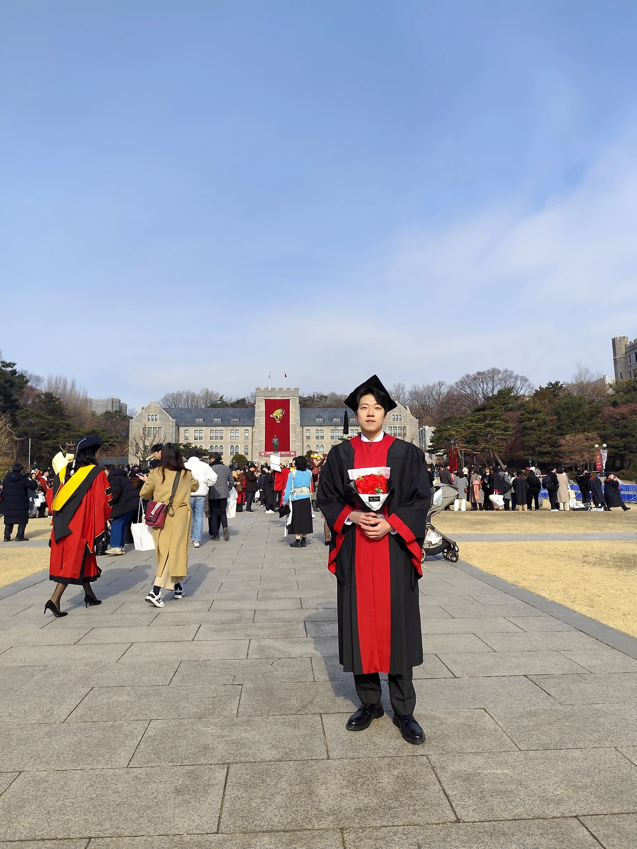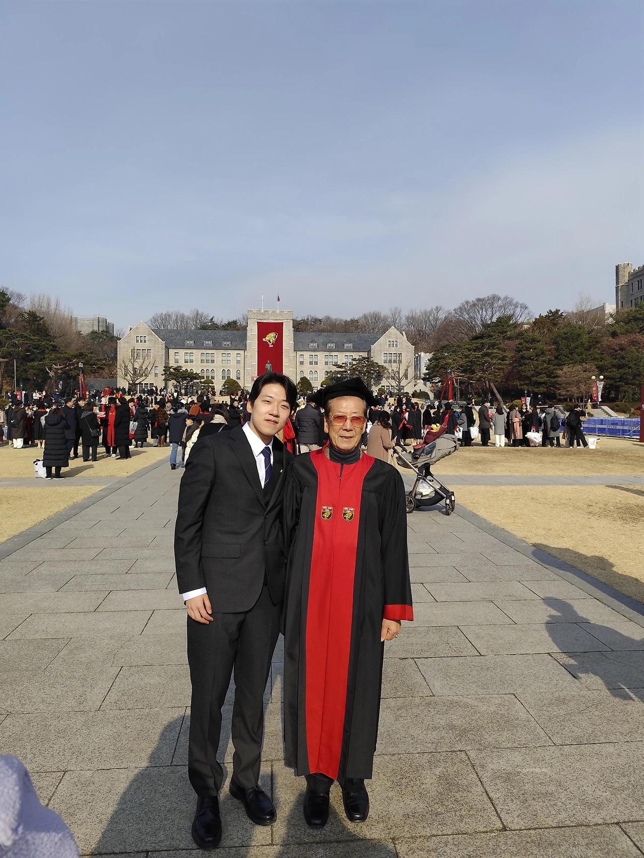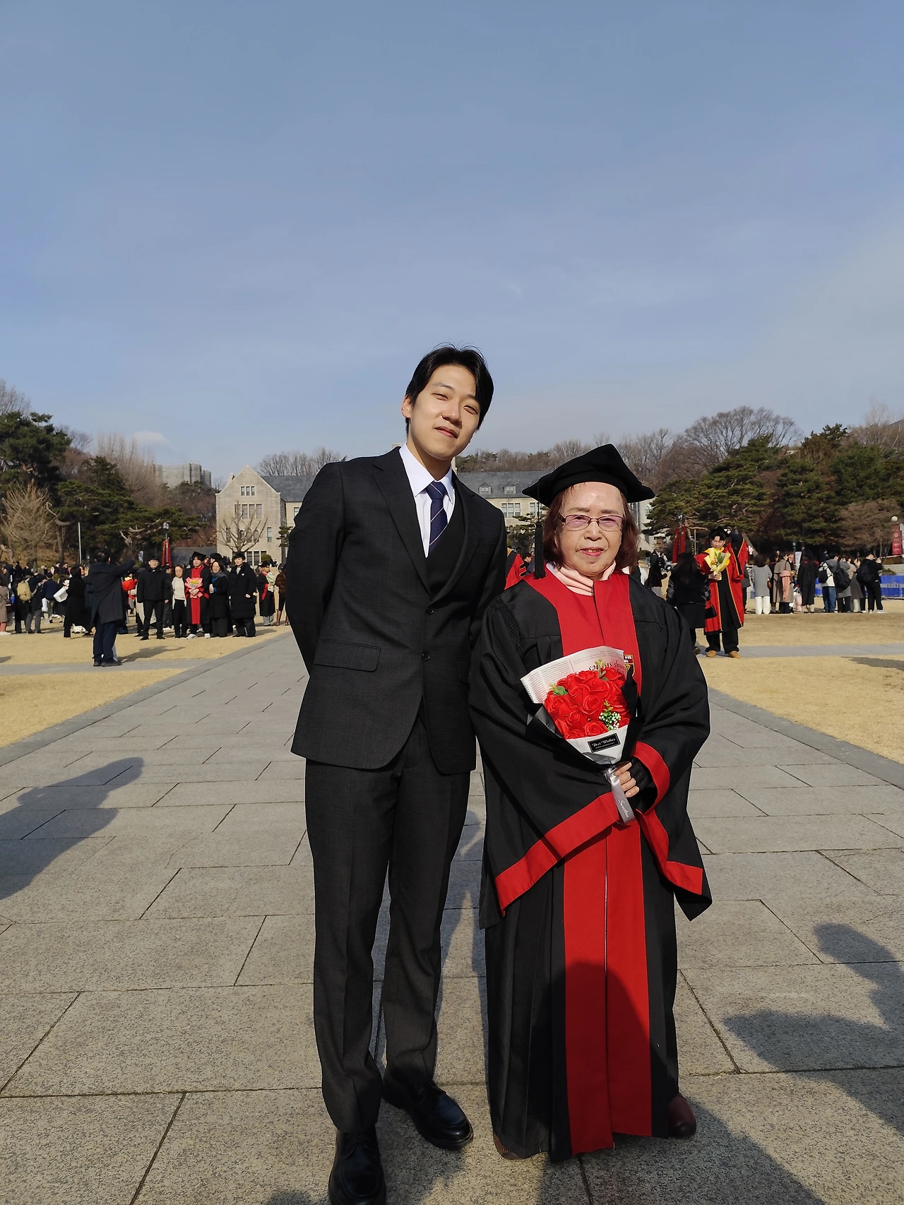 학사복과 학사모를 쓰고 사진을 찍는 아들 옆에서,