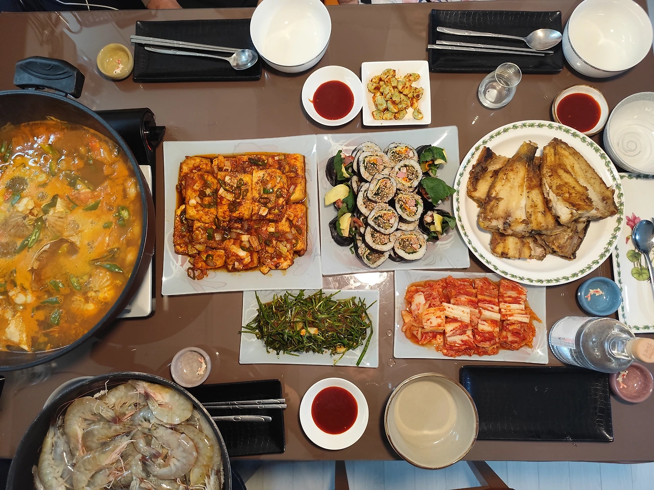 꽃게탕을 끓이고, 이면수구이, 대하소금구이, 두부조림, 삼겹살 수육으로 안주를 삼고 김밥으로 식사를 대신하며 전통주를 나누어 마셨습니다.