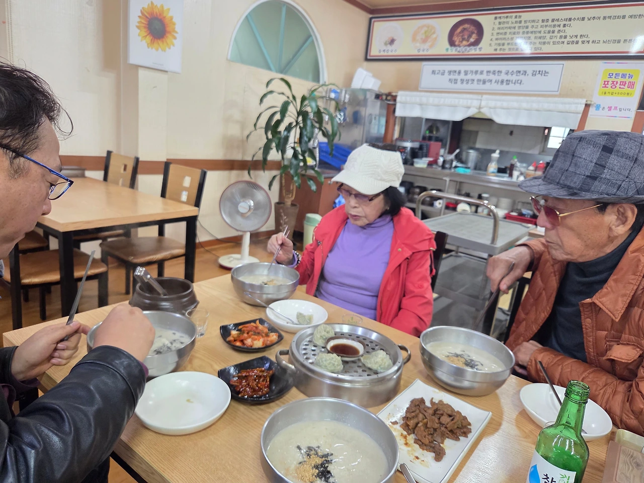 들깨 칼국수 네 그릇에 만두 하나, 돼지 불고기 하나, 소주 1 병.