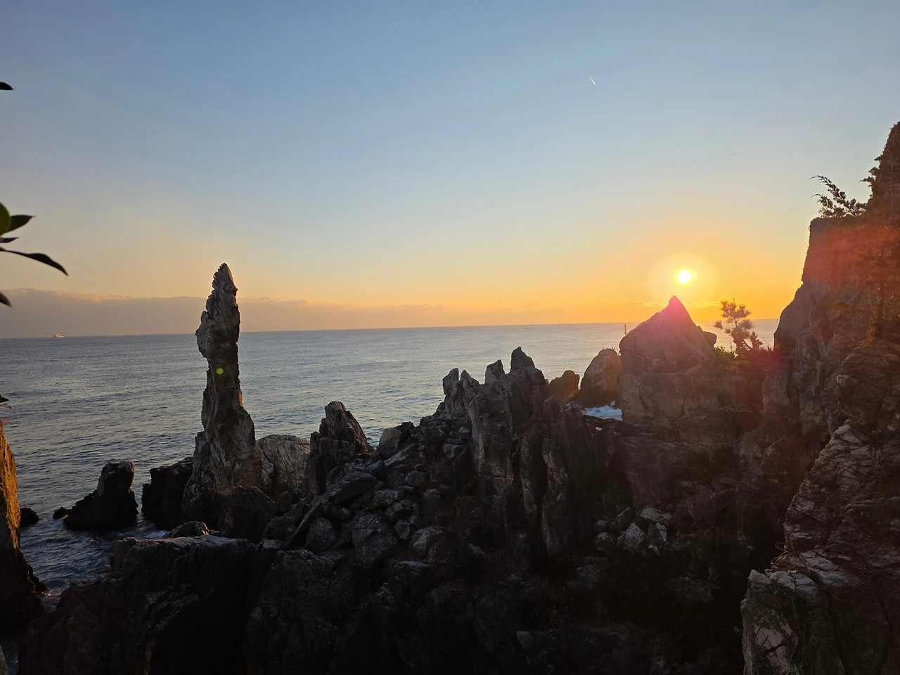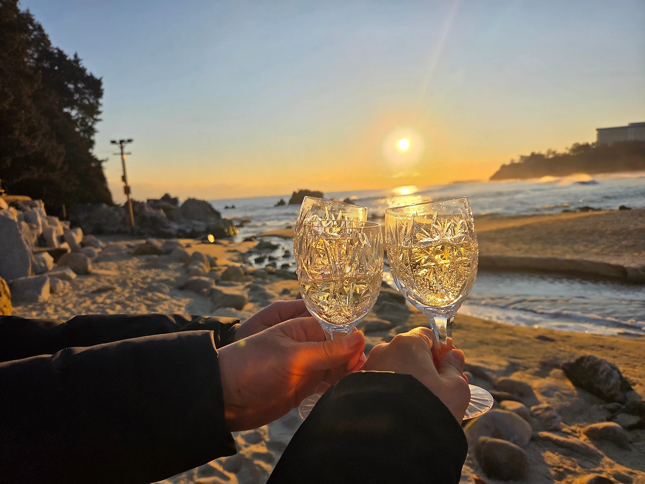 해변에서 일출을 보고 허위허위 동산에 올라 촛대바위를 안고 뜨는 해를 한 장 찍고, 다시 해변에 내려 태양을 바라보며 올해의 첫 와인으로 새해를 축하했습니다.