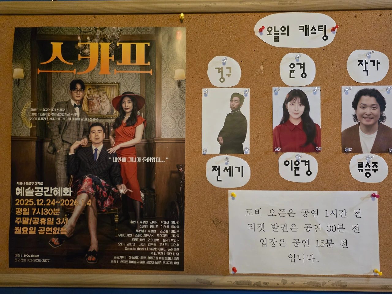 코끝이 찡하도록 추운 겨울 공기를 가르고 다시 대학로로 나온 이유는 미친 듯이 웃으며 보았던 연극 스카프의 앵콜공연이 있기 때문입니다.