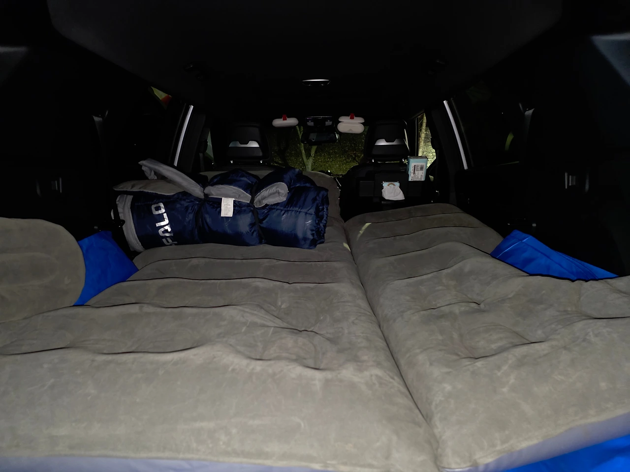 출발 전에 뒷 좌석을 평탄화하고, 에어매트에 공기를 빵빵하게 채우고, 자석 암막커튼을 붙이고, 형식적이지만 이불을 대신할 침낭도 하나 넣었습니다.