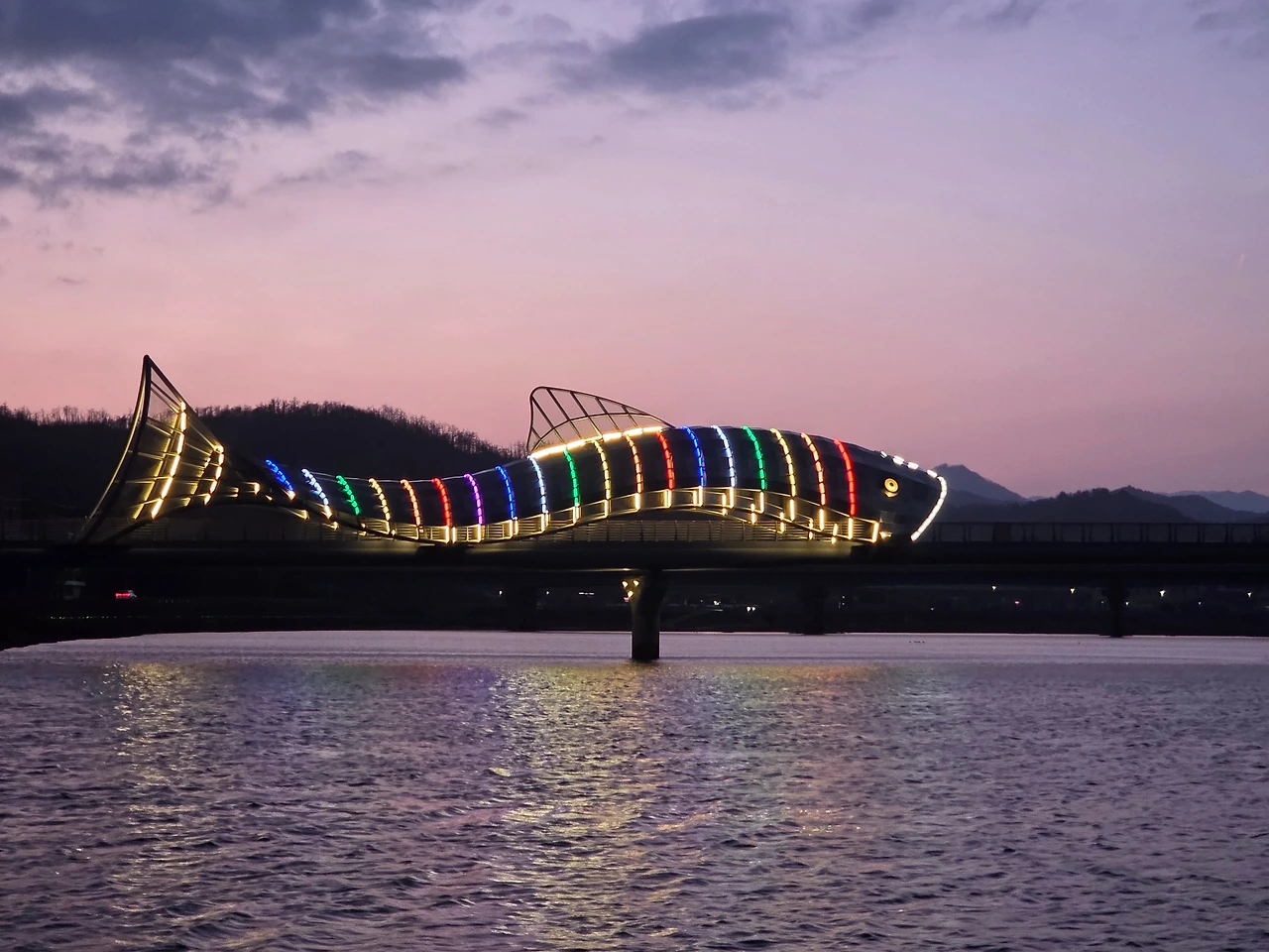 남대천 하구에 있는 은어 다리에서 일몰을 보고 야간 점등이 될 때까지 기다리는 동안에 얼어 죽을 뻔했습니다.