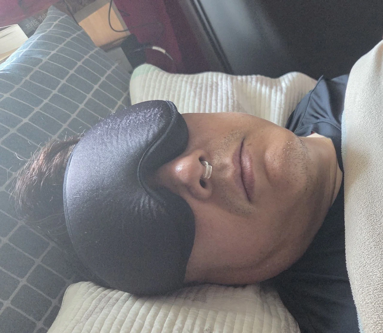 암막커튼이 있음에도 불구하고 안대를 하고 잡니다. 며칠동안 코를 좀 심하게 골았는지 을녀가 비강확장기를 사서 코에 꽂았습니다. 그렇게 조금씩 이 아름다운 꽃중년의 얼굴 하나가 가려집니다. 이 장면에서 눈물이 앞을 가리는 분들이 꽤나 있겠지요. 돈 크라이 포미...ㅋ