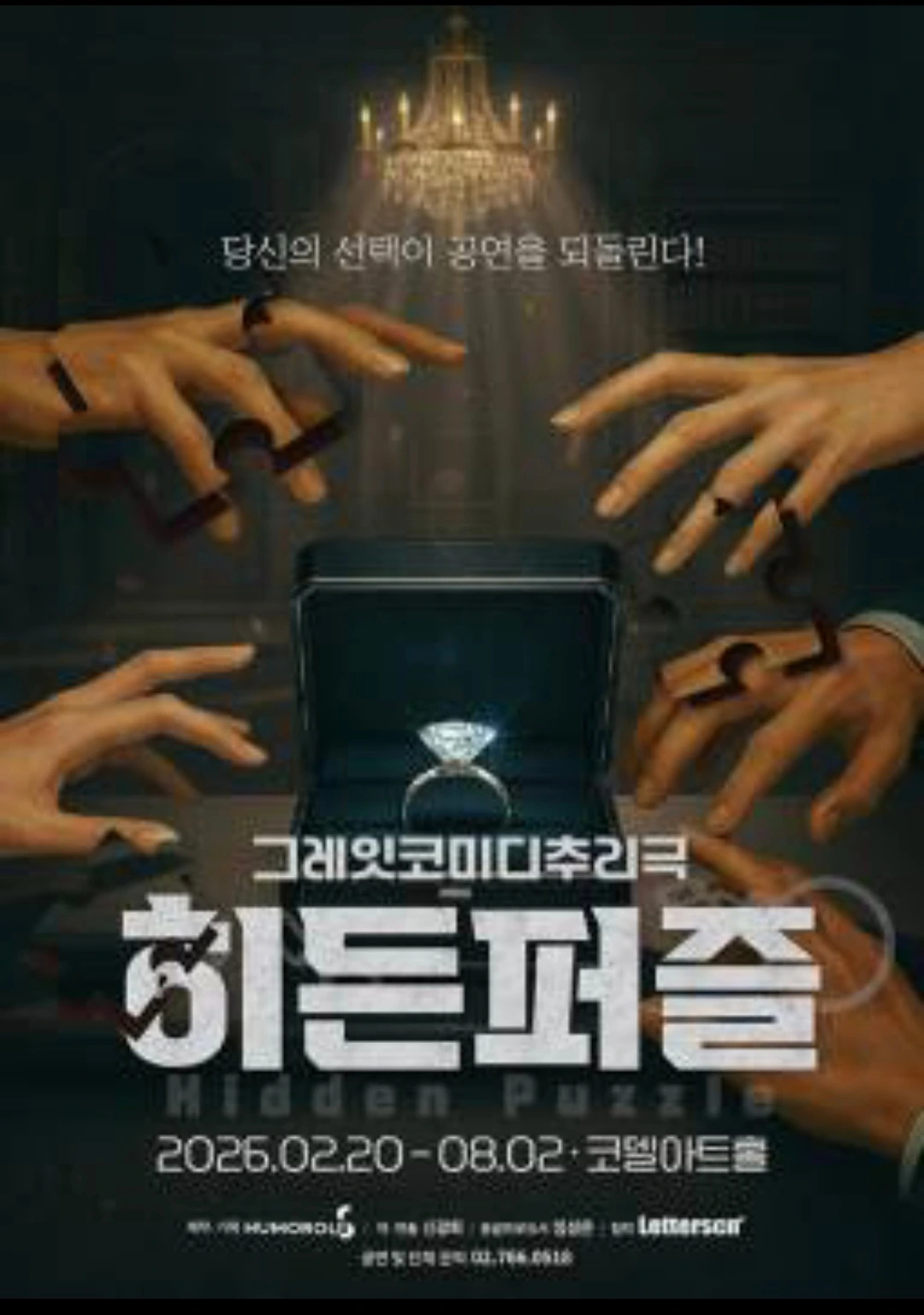 연극 히든퍼즐은 관객이 직접 추리 과정에 참여하여 범인을 지목하는 관객 참여형 코미디 추리극입니다. 연극 종료 후 사건발생 4일 전의 과거와 4년 후의 미래를 관객들의 선택으로 2가지 버전을 준비해 두었더군요.
