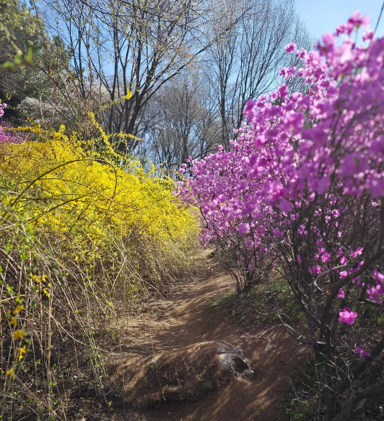 복숭아꽃, 살구꽃, 아기진달래~ 정겹던 노래처럼 개화시기가 겹치는 봄동산에 올라 복숭아꽃은 못 보았어도 흐드러진 진달래꽃 사이로 몽글몽글 살구꽃, 무덕무덕 개나리꽃, 희끗희끗 벚꽃과 갈색의 나무들과 파란 하늘까지 색의 향연, 빛의 축제를 마음껏 즐기며 기분 좋은 땀을 흘렸습니다.