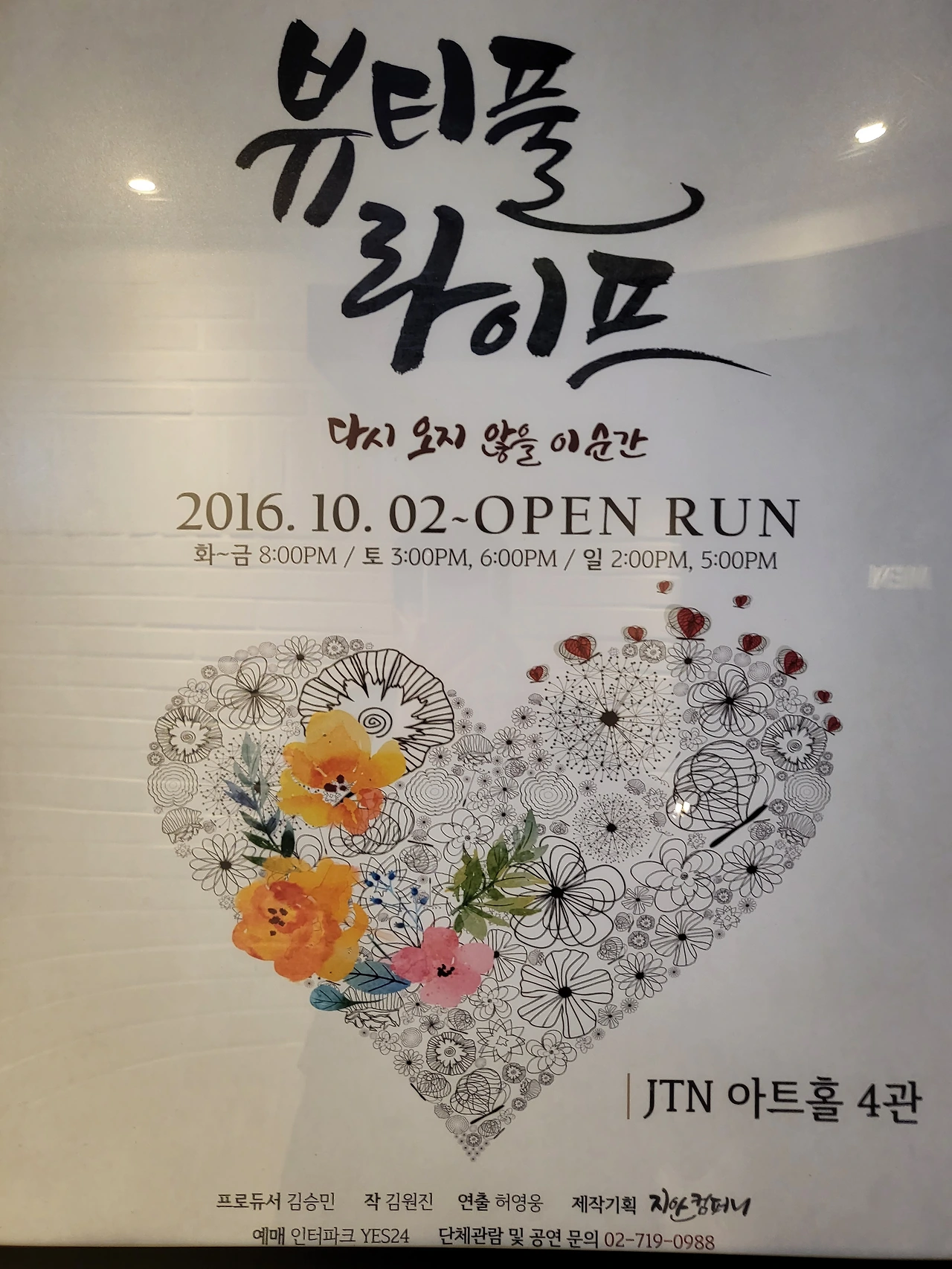 5층에서 1층으로 이어지는 계단을 내려오면서 저를 비롯한 사람들이 말이 없습니다. 눈 앞이 캄캄한 삶을 연기한 배우들이 눈 앞에 펼쳐지는 모든 날들이 뷰티풀 라이프가 되기를 바란다는 덕담이 극장 건물의 출입문을 밀고 나서는 순간 현실이 되는 마법이 펼쳐집니다. 고개를 들어 더 따뜻해진 세상을 크게 훑어봅니다.
