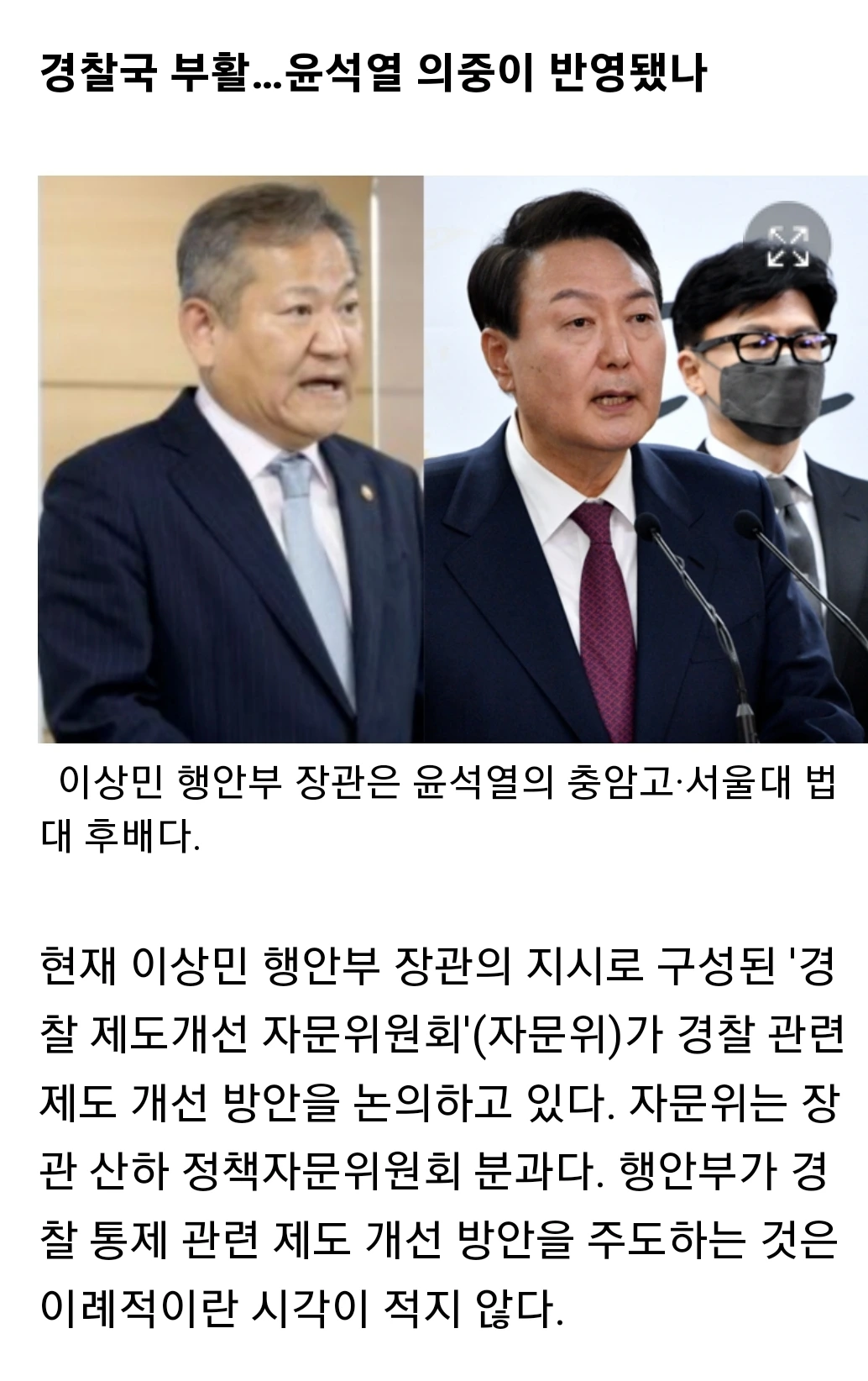 경찰의 독립성을 훼손할 우려가 있고, 경찰을 장악하려는 시도를 받아들일 수 없다는 저항과 이를 위해 경찰청장은 행안부장관의 부하가 아니라는 경찰청장의 말에 또 개거품을 문다면....
