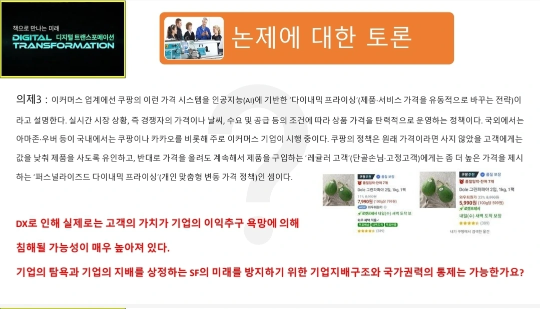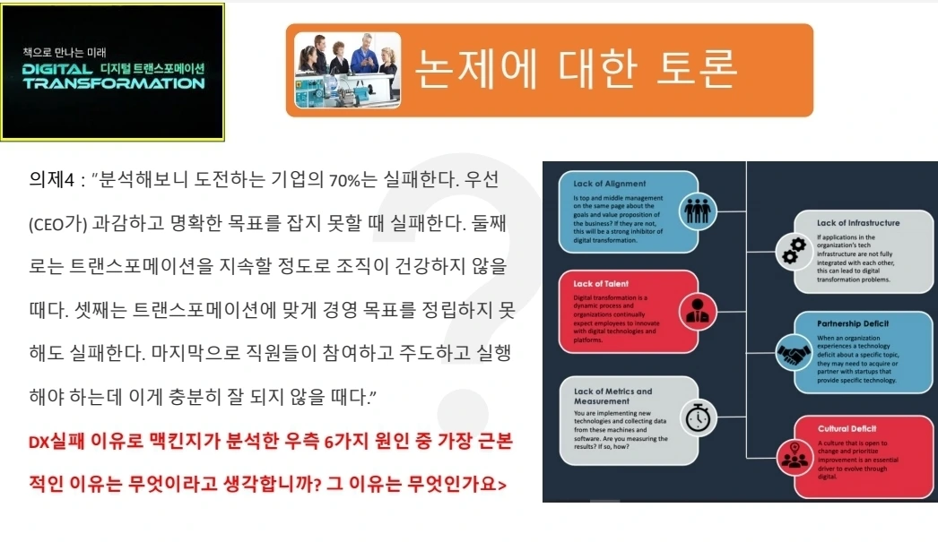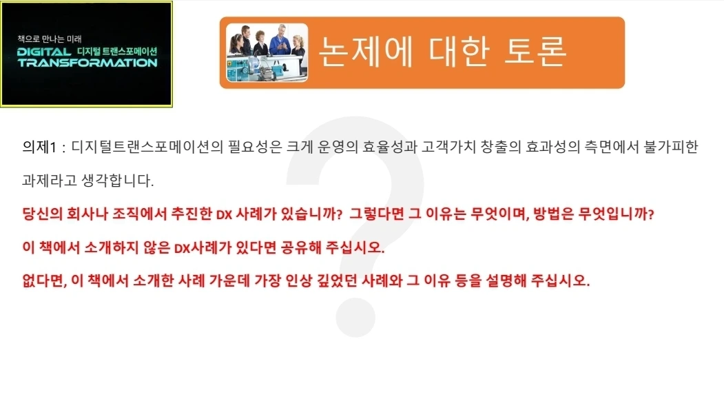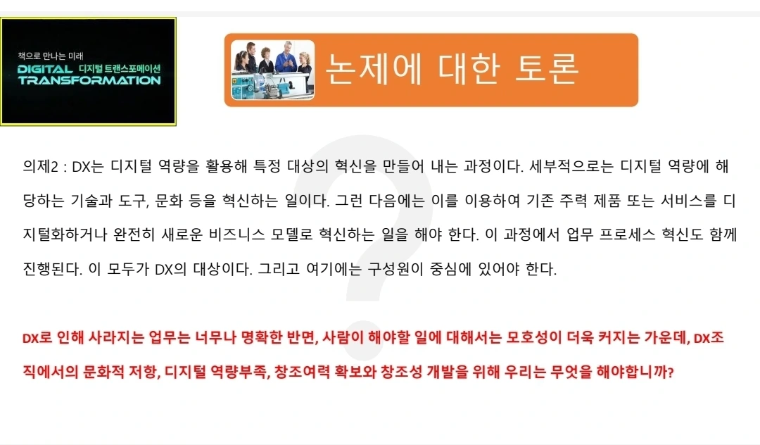 DX의 개념, 필요성, 추진체계와 방식, 내재화에 이르는 변화관리의 중요성 등을 다룬 책을 읽고, 멤버들 자신의 DX에 대한 이해와 경험, 추진과정에서의 개인의 과제와 조직의 과제, 소비자 편익과 가치에 관한 고객관점, DX성공을 위한 핵심요인에 대해 개인이 가진 선택적 지각과 인사이트를 공유하는 시간을 가졌습니다.
