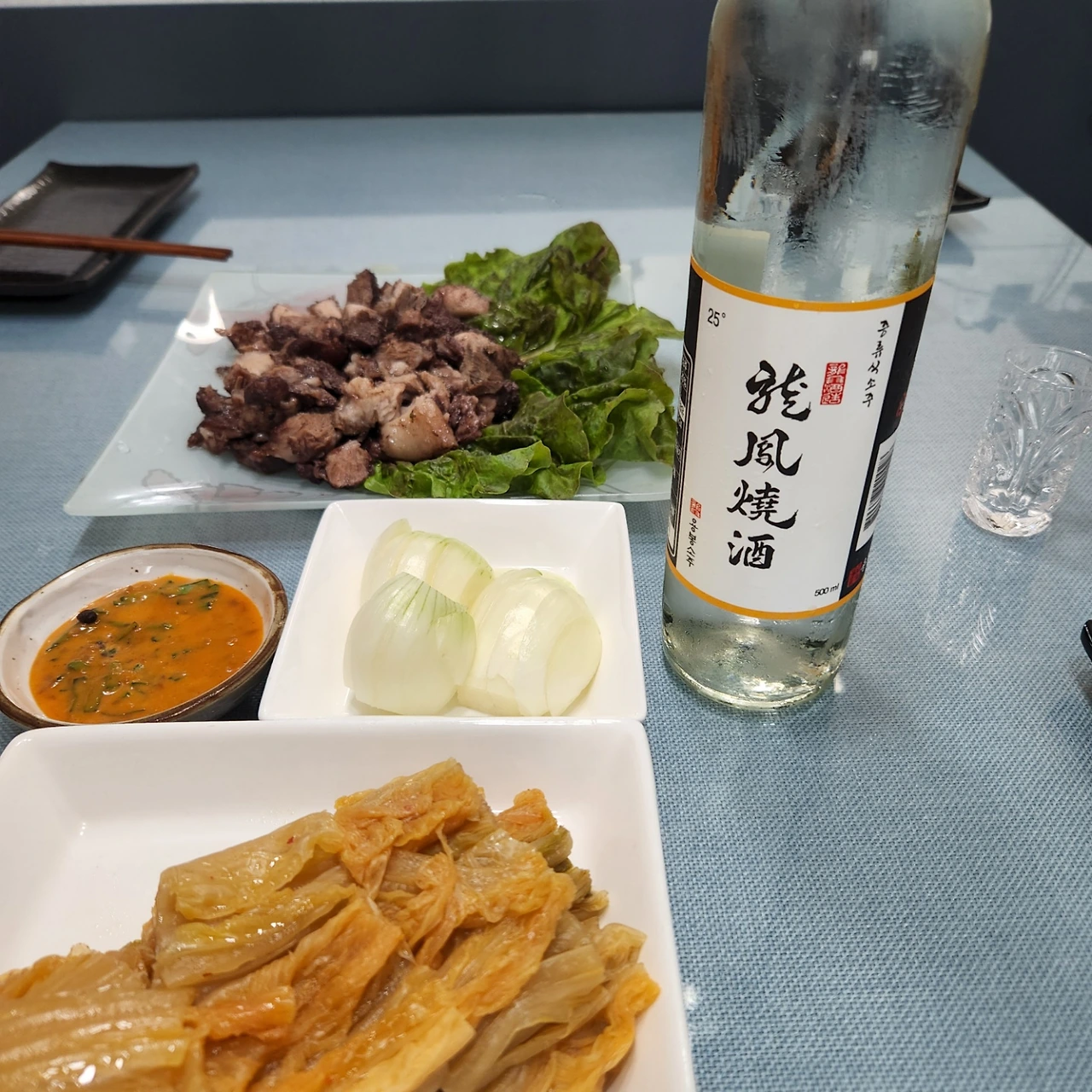 부모님과 저녁 식사를 하면서 전통주 용봉소주를 땄습니다.