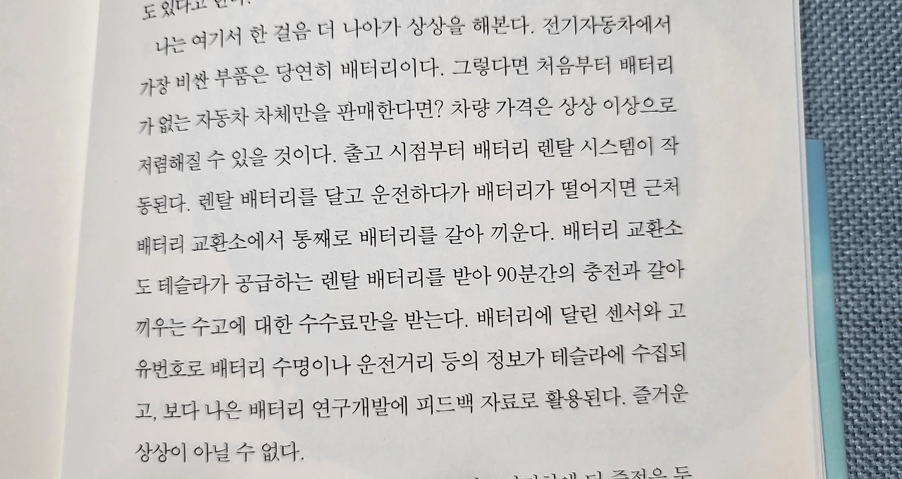 "나는 여기서 한 걸음 더 나아가 상상을 해본다. 전기자동차에서 가장 비싼 부품은 당연히 배터리이다. 그렇다면 처음부터 배터리가 없는 자동차 차체만을 판매한다면?