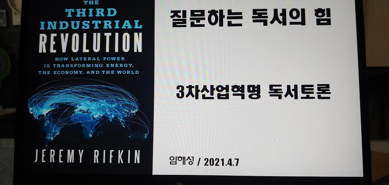 어제밤 7시부터 10시까지 3시간동안 제러미 리프킨의 3차산업혁명을 가지고 독서토론을 했습니다.