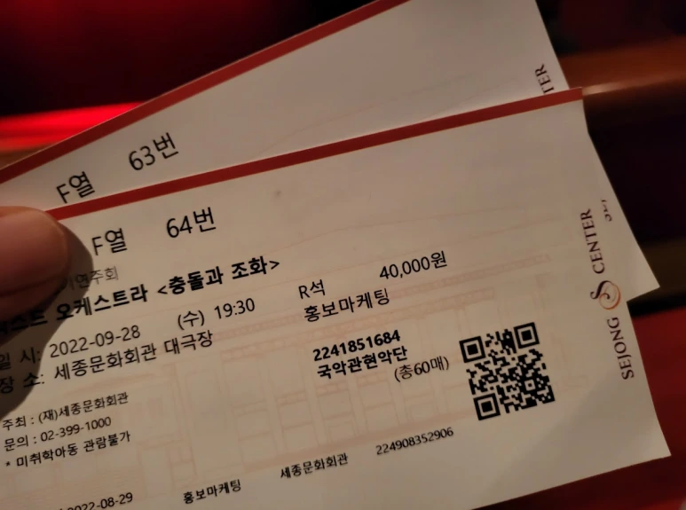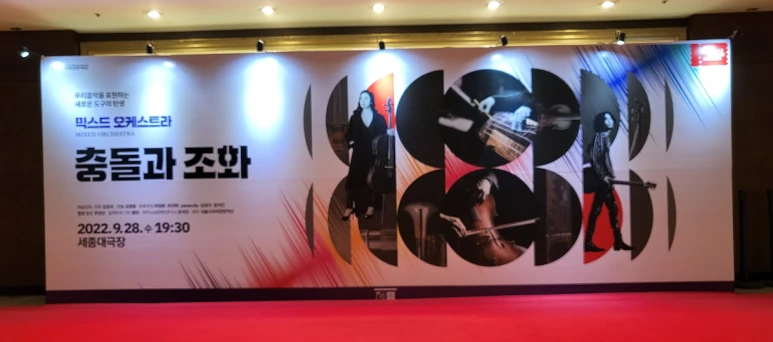 서울시국악관현악단의 김성국 단장이 올해 초 취임할 때부터 구상한 콘텐츠로, 오랜 고심과 준비 끝에 ‘2022 믹스드 오케스트라 <충돌과 조화>’라는 이름으로 관객을 만나게 되었답니다. 단 하루뿐인 공연이라 저는 망원경까지 챙겨들고 보았습니다. 저 개인적으로도 양악기와 국악기를 어떻게 배치해서 연주회를 하는지가 너무 궁급했거든요. 55명의 국악관현악 연주자, 35명의 서양 오케스트라 연주자 등 세종대극장 무대를 가득 채우는 90여 명 규모로 대규모 오케스트라의 향연을 즐길 수 있었습니다.