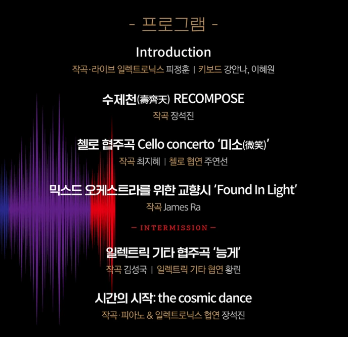 ‘첼로 협주곡 Cello concerto <미소(微笑)>(최지혜)’, 태평소 능게가락을 주제로 한 ‘일렉트릭 기타 협주곡 <능게>(김성국)’, 거대하면서도 세밀한 음색과 음향의 디자인 ‘시간의 시작 : the cosmic dance (장석진)’의 곡을 만들었습니다.