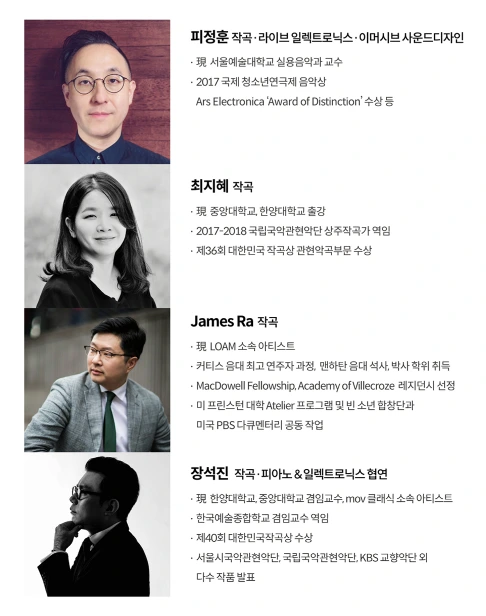 김성국 단장을 포함하여 홍정의(The Waves Entertainment 프로듀서), James Ra(LOAM 소속 아티스트), 최지혜(중앙대, 한양대 출강), 장석진(mov 클래식 소속 아티스트) 등 5명의 작곡가가 모였습니다.