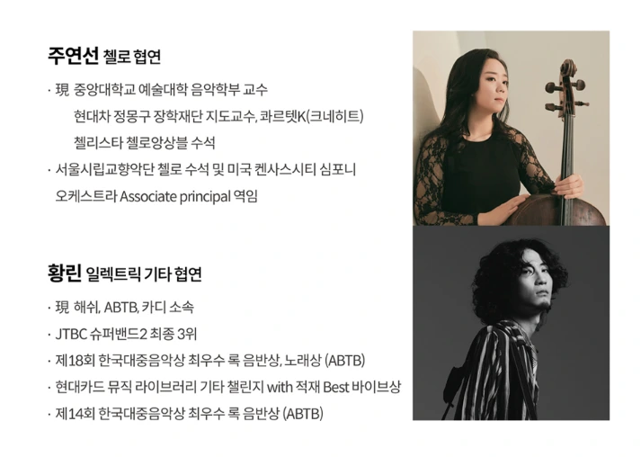 여기에 서울시립교향악단 첼로 수석을 역임하고 그룹 ‘콰르텟 크네히트’, ‘첼리스타 첼로 앙상블’로 활동하는 첼리스트 주연선과 2015년 해쉬 디지털 싱글앨범 ‘Addiction’ 으로 데뷔 후 제14회 한국대중음악상 최우수록 음반상 수상하고, 최근 ‘슈퍼밴드2’에서 밴드 ‘카디’로 최종 3위에 오른 일렉트릭 기타리스트 ‘황린’이 함께 했죠.