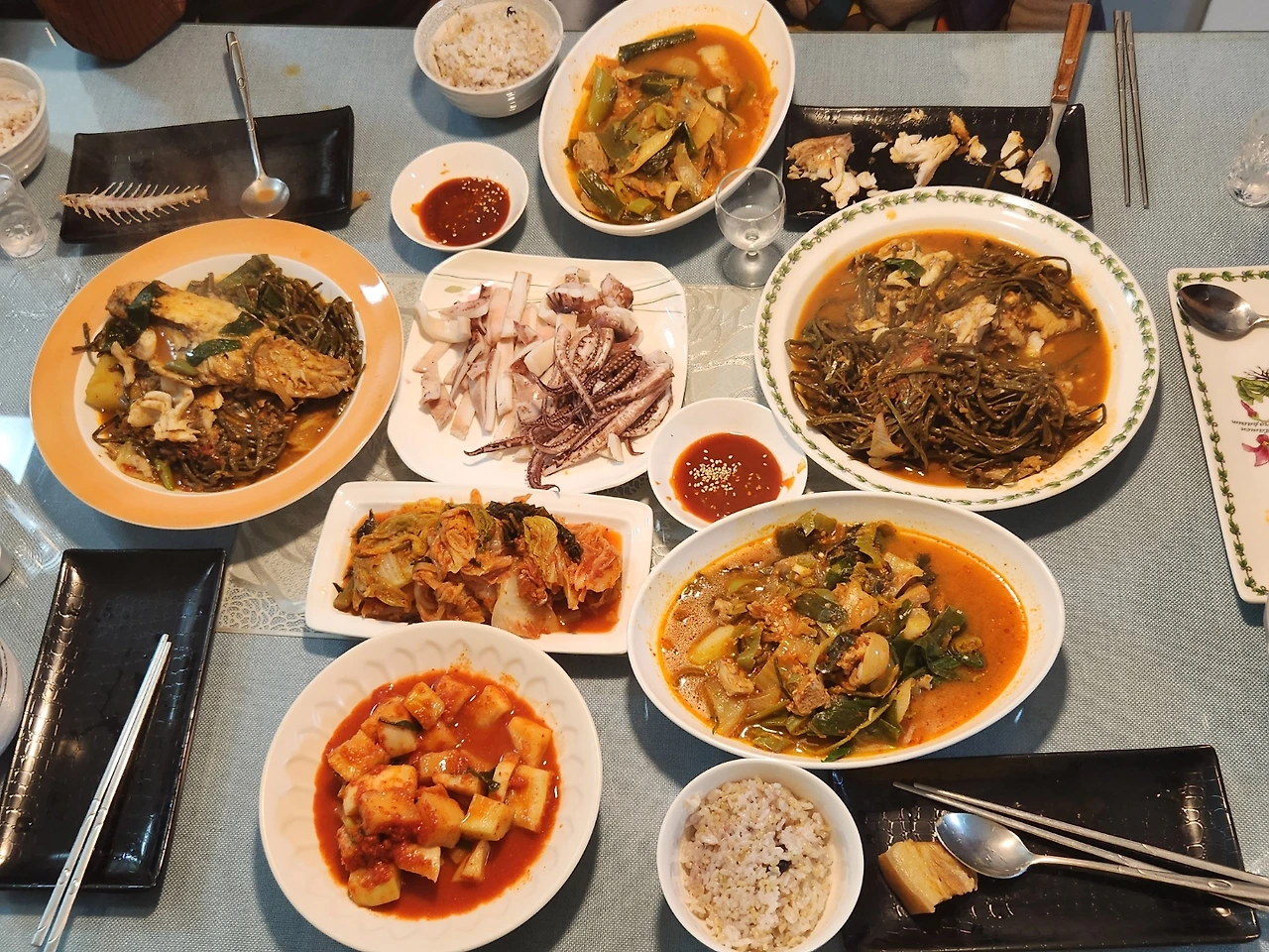 골절수술에서 빠르게 회복중인 엄마가 좋아하는 생선류로는 뽈락조림과 오징어숙회를 준비하고 아버지를 위해서는 시골에서 잡은 돼지고기를 넣고 끓인 김치찌개를 마련해서 좋은 술과 함께 마셨습니다.
