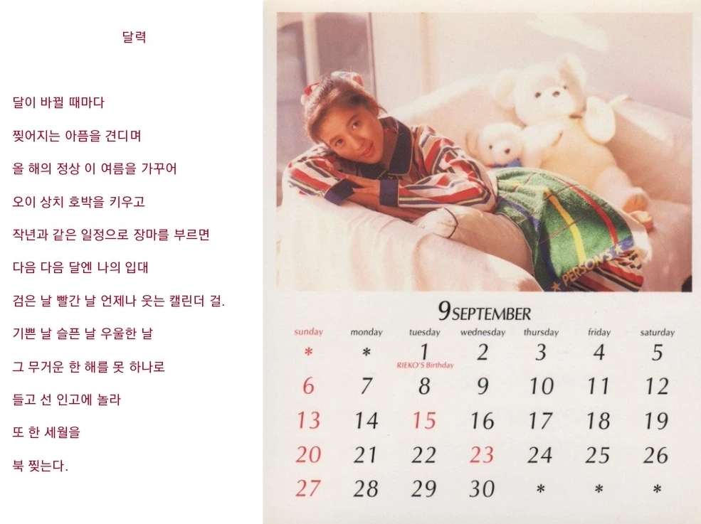 제 군 입대일이 9월이었으니 대학교 3학년 시절인 1991년 7월에 쓴 것이로군요. 군입대라는 극단적인 변화와 긴장, 불안을 내포한 주관적인 시간인 카이로스를, 객관적이고 연대기적이며 가치중립적인 크로노스의 시간으로, 그런 객관성을 담보하는 증거로서의 달력으로 치환하려는 무의식이 엿보이네요. 이젠 제가 제대했을 뿐 아니라 제 아들까지 제대를 했으니 순환적 시간인 아이온을 떠올리며 가벼운 미소를 지을 정도로 여유로운 일요일입니다.