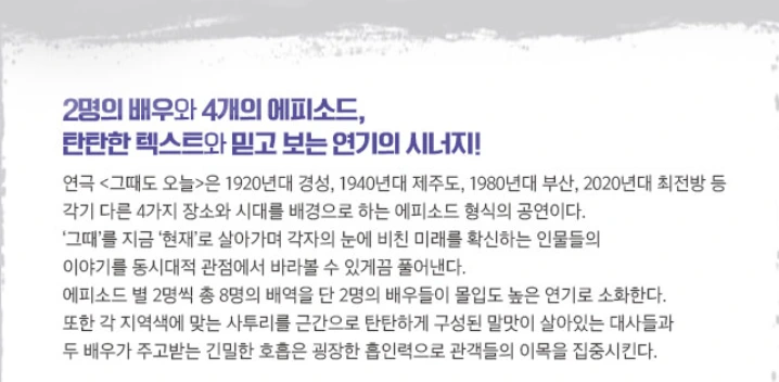 남자 두 명의 배우가 나오는 작품이군요. 오늘도 마찬가지로 우리는 시놉도 보지 않고 배우가 누군지도 확인하지 않고 우리가 시간이 되는 때에 극장을 찾습니다. 개찰구를 나오는 순간부터 모든 것이 발견의 연속이고, 놀라움의 연속입니다. 아무런 기대를 갖지 않고 담담하게 극장 안으로 들어가는 거죠. 거기서 살짝 흥분을 하게 될지, 살짝 실망을 하게될 지는 저희도 역시 모릅니다.