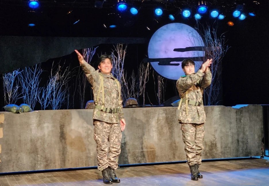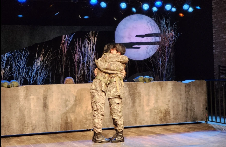 친구지만 선후임의 입장으로 함께 군 생활을 하는 은규와 문석은 최전방 부대에서 보초를 서고 있는 중입니다. 벌써 남북한이 분단이 된 지도 70년이 넘어 80년이 다 되어가는 아주 가까운 미래의 그들은 왜 싸우는가에 대한 근본적인 질문을 던집니다. 우리는 왜 갈라졌고 무엇을 위해 싸우고 있는가...그런 생각에 대한 답변을 들을 새도 없이 비상이 발령되고 총소리가 들려옵니다. 무대가 어두워지고 그 짙은 어둠 속에서 절규하는 총소리가 빈 무대를 가득 채우며 연극은 우리를 현실로 이끌어 냅니다.