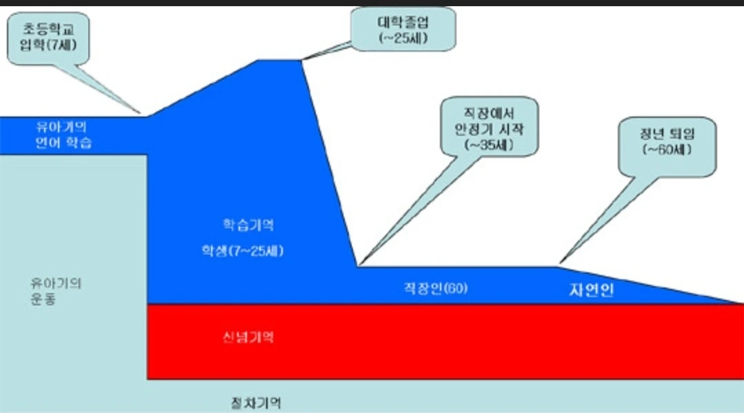 파란색의 학습기억은 외부의 자극을 통해 새롭게 배움으로써 형성되는 기억입니다. 대학시절을 정점으로 해서 급격하게 줄어드는 모습을 보입니다.